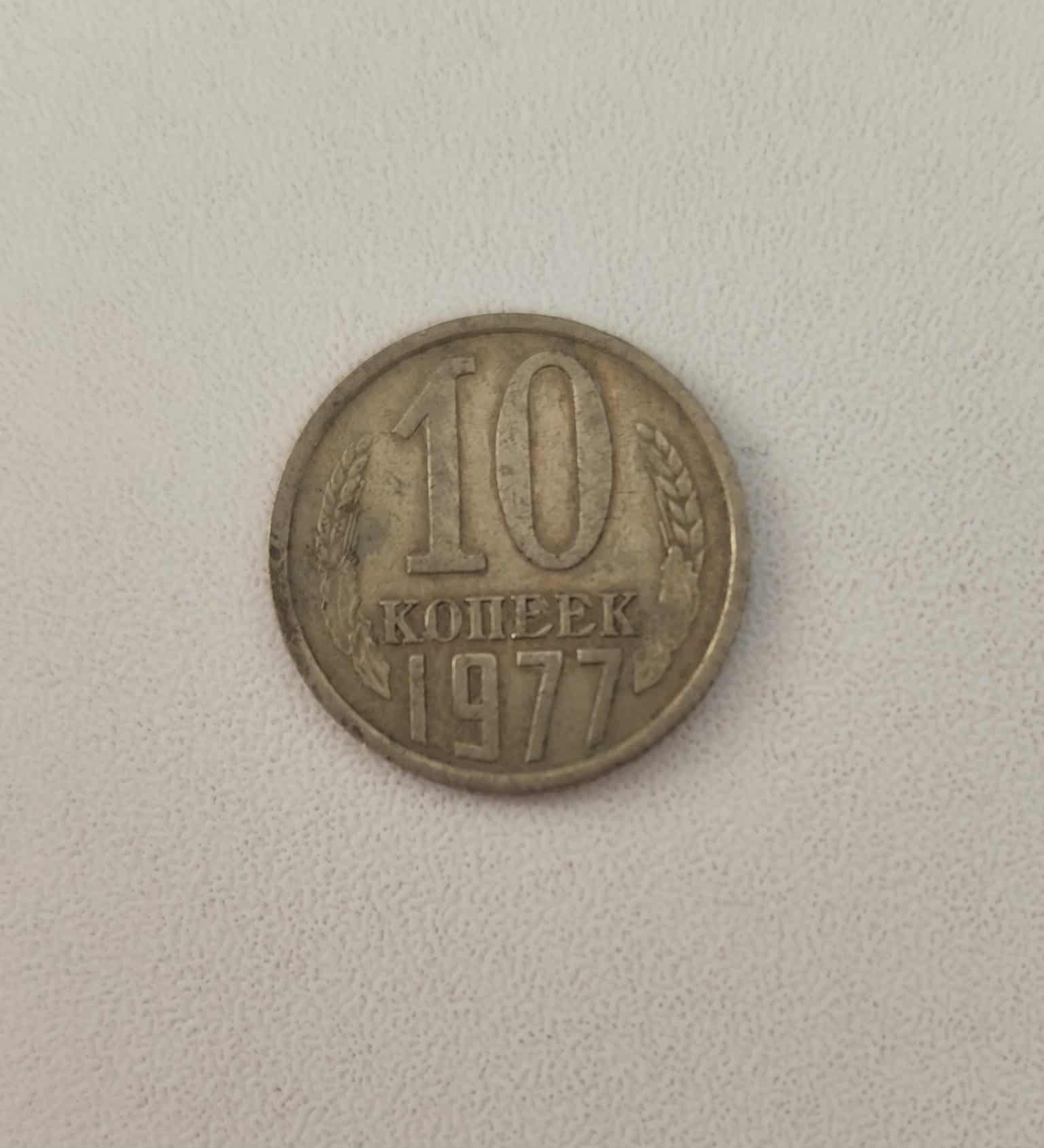 Monedă de formă rotundă care pe revers are stema Uniunii Sovietice, formată dintr-o seceră și un ciocan, simboluri ale unității muncitorilor și țăranilor, așezate pe globul pământesc. În spatele globului se ridică un soare, iar totul este înconjurat de două spice de grâu legate la bază cu o panglică pe care scrie CCCP (abrevierea pentru Uniunea Republicilor Socialiste Sovietice, în rusă). Deasupra stemei se află o stea cu cinci colțuri. Pe aversul monedei sunt inscripționate valoarea nominală 10 , iar sub el scrie КОПЕЕК (Kopeek), care înseamnă copeici. Sub valoare este anul de emisiune: 1977. Toate aceste elemente sunt înconjurate de două spice de grâu.