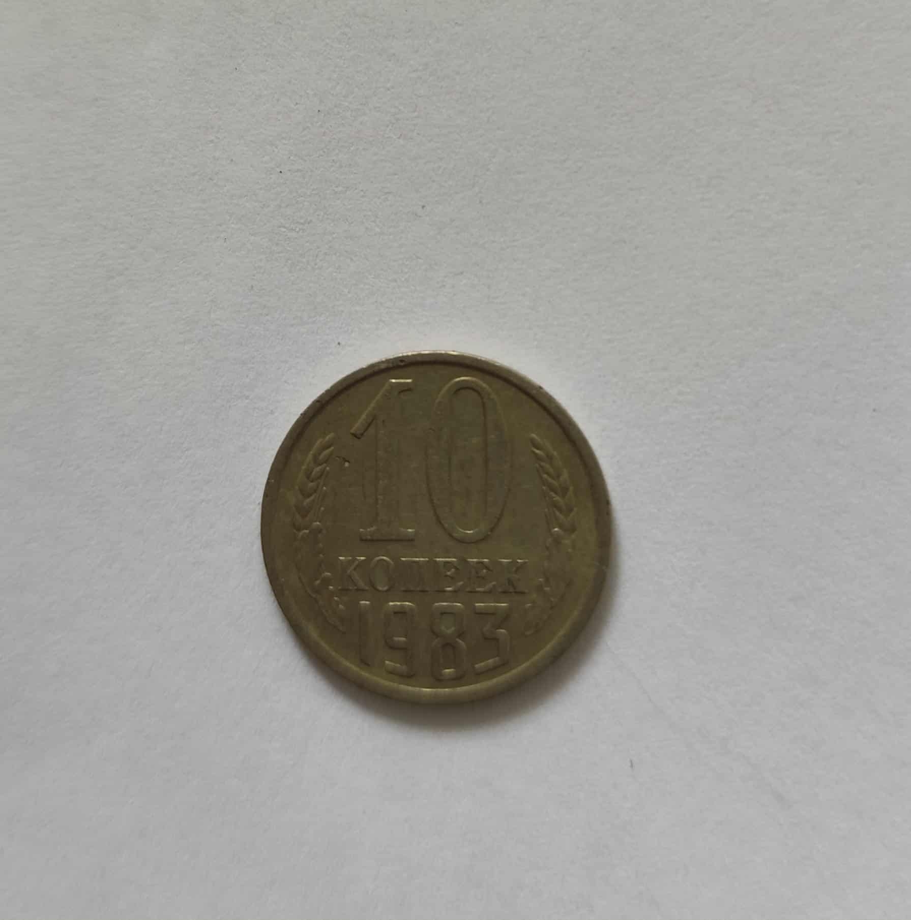 Monedă de formă rotundă care pe revers are stema Uniunii Sovietice, formată dintr-o seceră și un ciocan, simboluri ale unității muncitorilor și țăranilor, așezate pe globul pământesc. În spatele globului se ridică un soare, iar totul este înconjurat de două spice de grâu legate la bază cu o panglică pe care scrie CCCP (abrevierea pentru Uniunea Republicilor Socialiste Sovietice, în rusă). Deasupra stemei se află o stea cu cinci colțuri. Pe aversul monedei sunt inscripționate valoarea nominală 10 , iar sub el scrie КОПЕЕК (Kopeek), care înseamnă copeici. Sub valoare este anul de emisiune: 1983. Toate aceste elemente sunt înconjurate de două spice de grâu.