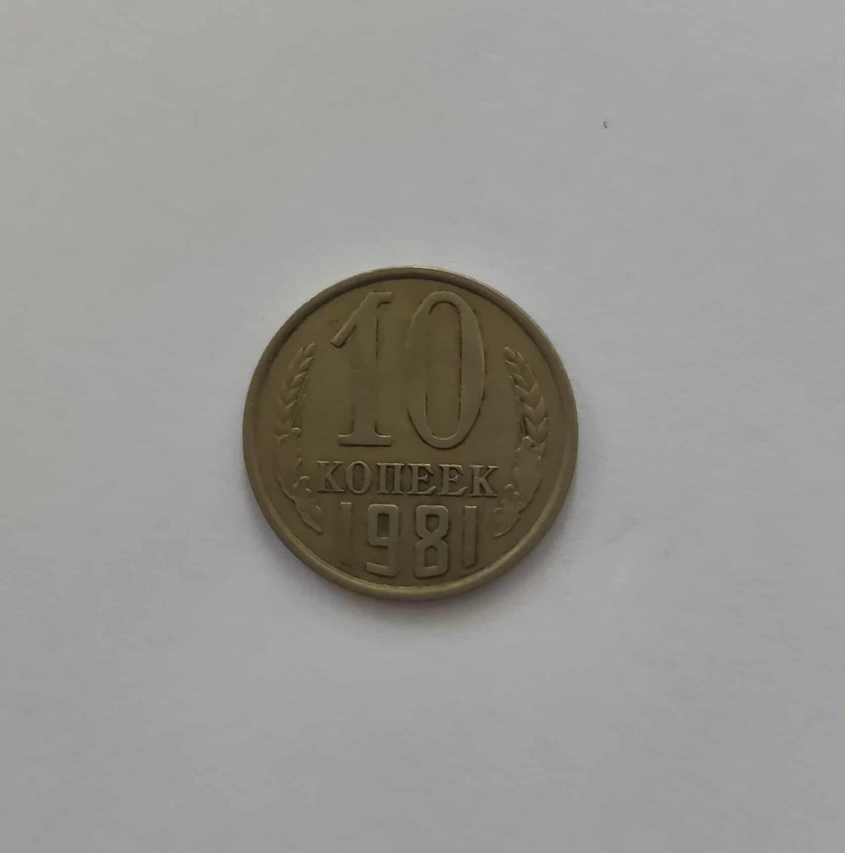 Monedă de formă rotundă care pe revers are stema Uniunii Sovietice, formată dintr-o seceră și un ciocan, simboluri ale unității muncitorilor și țăranilor, așezate pe globul pământesc. În spatele globului se ridică un soare, iar totul este înconjurat de două spice de grâu legate la bază cu o panglică pe care scrie CCCP (abrevierea pentru Uniunea Republicilor Socialiste Sovietice, în rusă). Deasupra stemei se află o stea cu cinci colțuri. Pe aversul monedei sunt inscripționate valoarea nominală 10 , iar sub el scrie КОПЕЕК (Kopeek), care înseamnă copeici. Sub valoare este anul de emisiune: 1981. Toate aceste elemente sunt înconjurate de două spice de grâu.