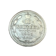 REVERS: În partea de sus, coroană imperială și valoarea nominală în două rânduri: 10 / КОПѢЕКЪ; în partea de jos, anul de emitere și atelierul monetar: 1903 / С.П.Б.; circular, două ramuri stilizate legate cu o panglică; câmp monetar mărginit de un cerc zimțat.