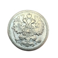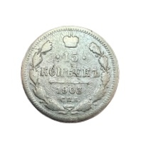 REVERS: În partea de sus, coroană imperială și valoarea nominală în două rânduri: 15 / КОПѢЕКЪ; în partea de jos, anul de emitere și atelierul monetar: 1902 / С.П.Б.; circular, două ramuri stilizate legate cu o panglică; câmp monetar mărginit de un cerc zimțat.