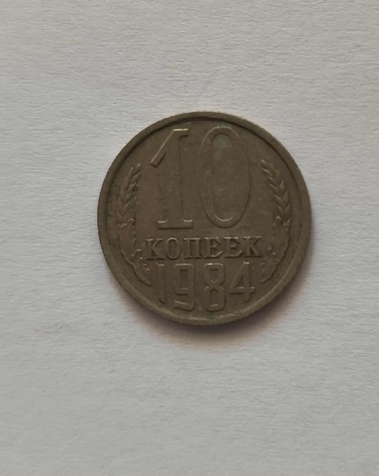 Monedă de formă rotundă care pe revers are stema Uniunii Sovietice, formată dintr-o seceră și un ciocan, simboluri ale unității muncitorilor și țăranilor, așezate pe globul pământesc. În spatele globului se ridică un soare, iar totul este înconjurat de două spice de grâu legate la bază cu o panglică pe care scrie CCCP (abrevierea pentru Uniunea Republicilor Socialiste Sovietice, în rusă). Deasupra stemei se află o stea cu cinci colțuri. Pe aversul monedei sunt inscripționate valoarea nominală 10 , iar sub el scrie КОПЕЕК (Kopeek), care înseamnă copeici. Sub valoare este anul de emisiune: 1984. Toate aceste elemente sunt înconjurate de două spice de grâu.