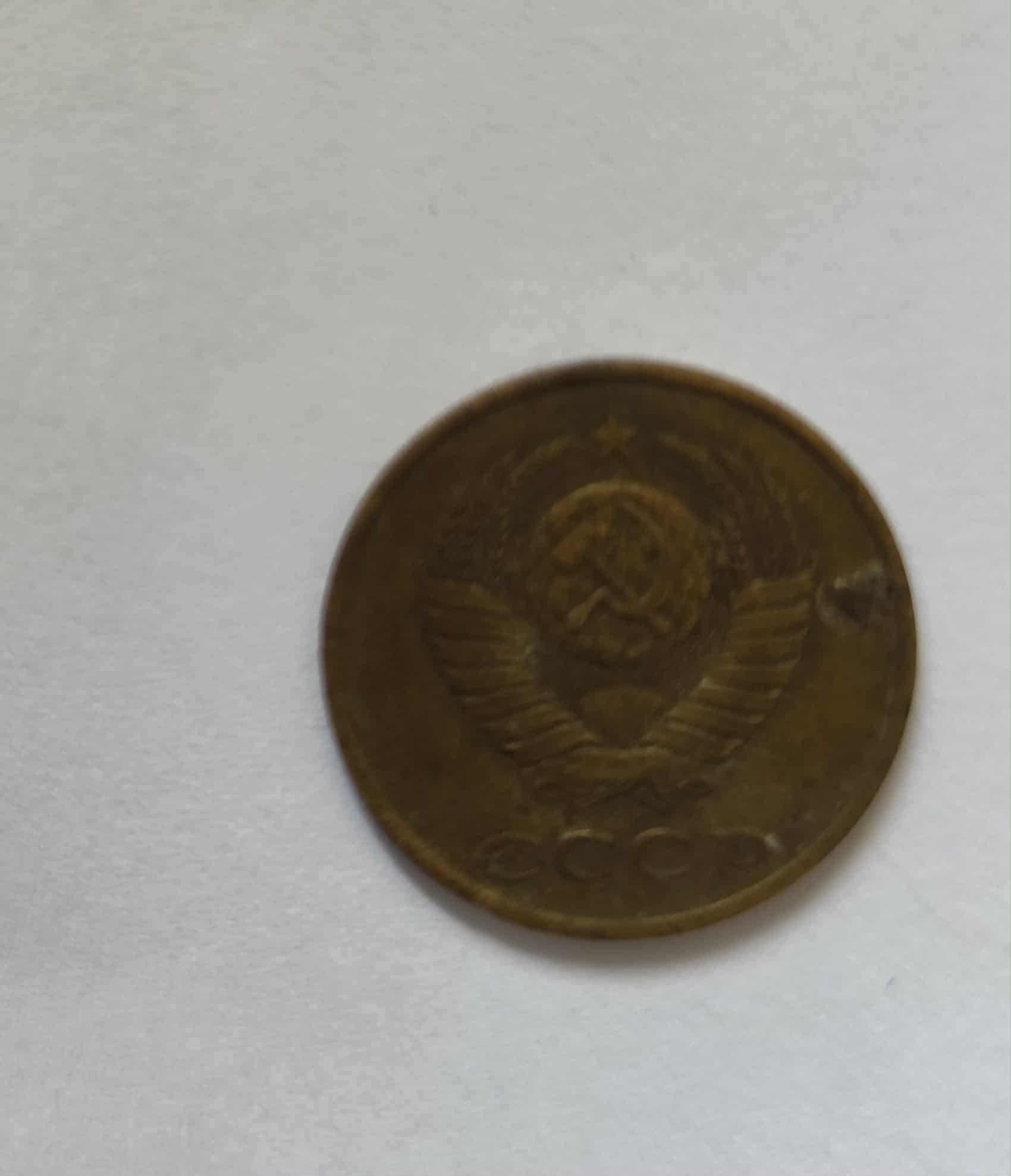 Monedă de formă rotundă care pe revers are stema Uniunii Sovietice, formată dintr-o seceră și un ciocan, simboluri ale unității muncitorilor și țăranilor, așezate pe globul pământesc. În spatele globului se ridică un soare, iar totul este înconjurat de două spice de grâu legate la bază cu o panglică pe care scrie CCCP (abrevierea pentru Uniunea Republicilor Socialiste Sovietice, în rusă). Deasupra stemei se află o stea cu cinci colțuri. Pe aversul monedei sunt inscripționate valoarea nominală 3 poziționată central- superior , iar sub el scrie КОПЙКИ (Kopeiki), care înseamnă copeică. Sub valoare este anul de emisiune: 1984. Toate aceste elemente sunt înconjurate de două spice de grâu.