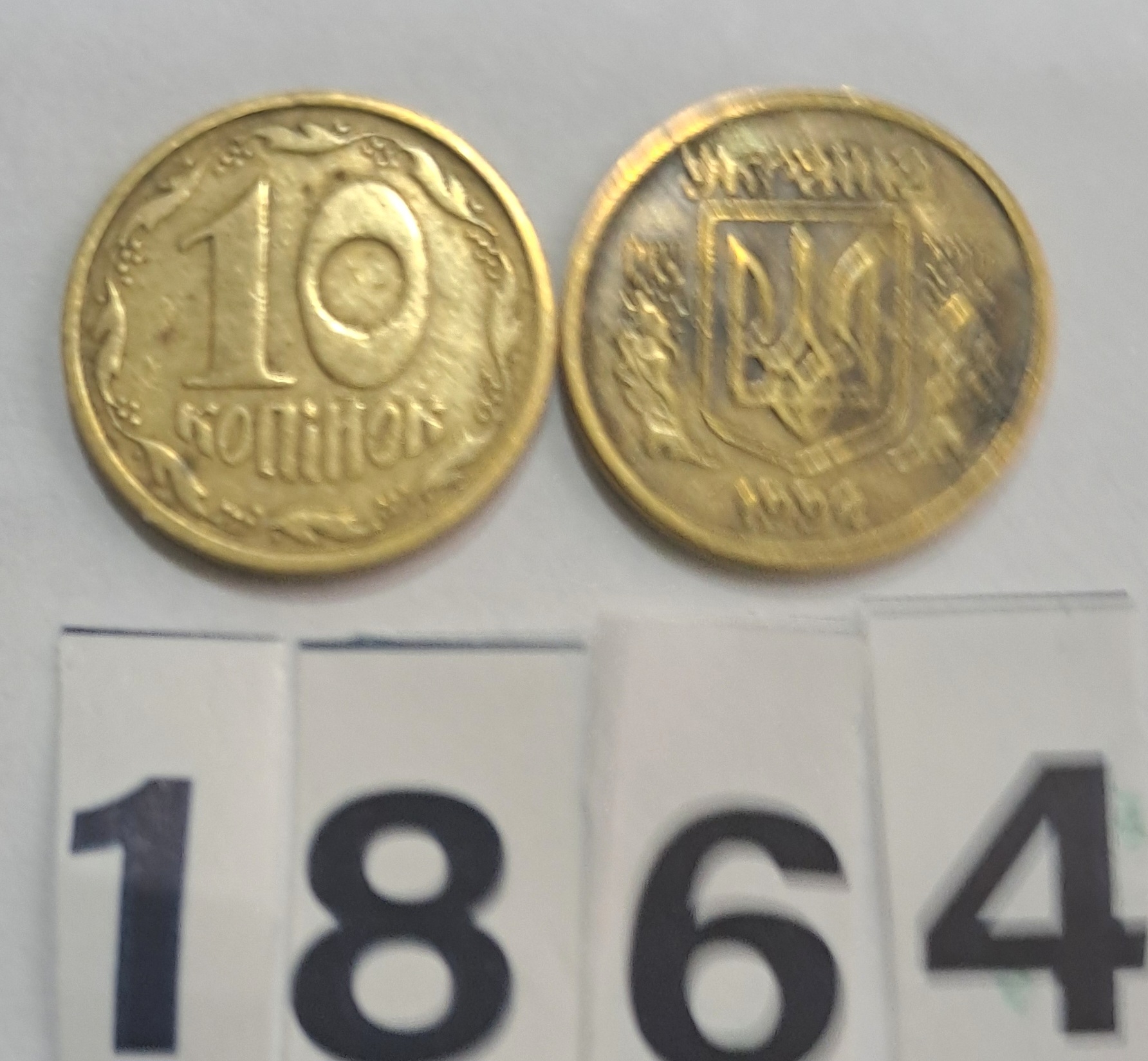 Monedă de formă rotundă, din metal, galbenă. Avers; În centru valoarea nominală - 10 КОПiЙОК , ornament - o coroană din ramuri de viță de vie stilizate . Revers : În partea de sus inscripția - УКРАИНА . În centru - Stema Ucrainei , două spice de grâu, în partea de jos anul de emitere 1994, câmp monetar mărginit de un cerc. Muchie: Netedă.