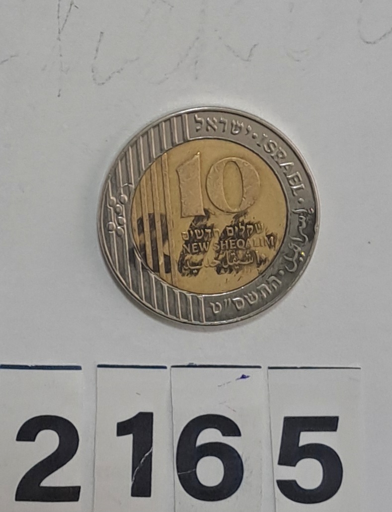Monedă de formă rotundă, bimetalică .Centru bronz, cerc din oțel, placat cu nichel. Avers; Pe centru, un palmier, stema , autorii Yosif Wahba, Ruben Nutels - inscripție în evraică .Revers: Pe circumferință denumirea țării ,ISRAIL în limba arabă, engleză și ebraică, anul emiterii 2015 . Nominalul 10 NEW SHEOALIM. Câmp monetar mărginit de un cerc. Muchie: Zâmțată.