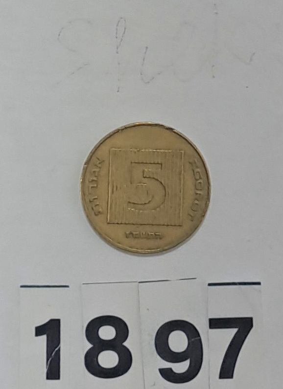 Monedă de formă rotundă, de culoare galbenă, din metal. Avers; Pe centru în patrat, nominalul 5 , sub el anul emiterii 1990 , în părți inscripția în evraică și engleză - ACOROT. Revers; imaginea unui pom în cerc, în stânga stema țării, inscripție ISRAEL- în limba ebraică, arabă și engleză. Câmp monetar mărginit de un cerc. Muchie: Netedă .