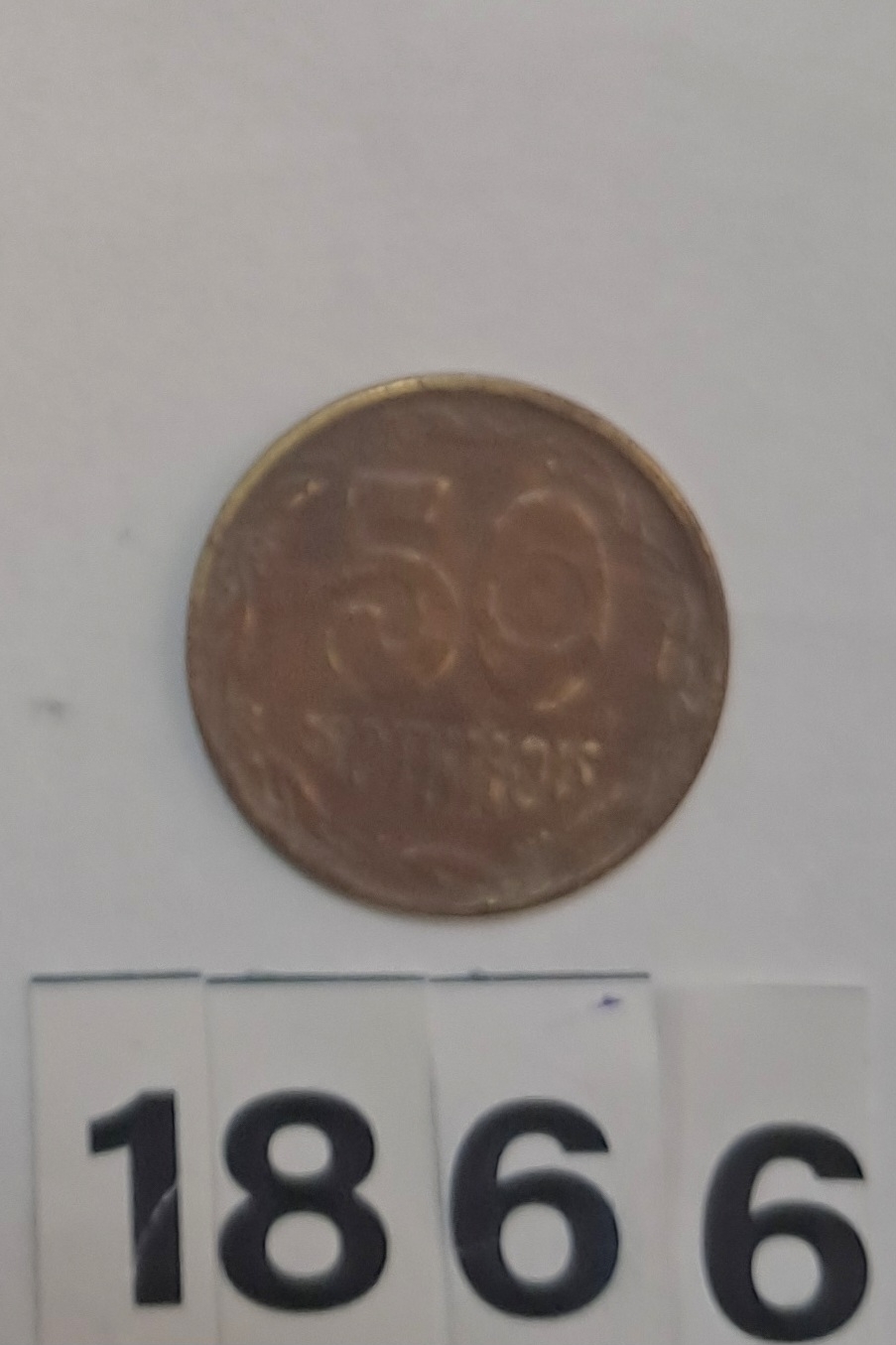 Monedă de formă rotundă, din metal, galbenă. Avers; În centru valoarea nominală - 50 КОПiЙОК , ornament - o coroană din ramuri de viță de vie stilizate . Revers : În partea de sus inscripția - УКРАИНА . În centru - Stema Ucrainei , două spice de grâu, în partea de jos anul de emitere 1995, câmp monetar mărginit de un cerc. Muchie: Netedă.