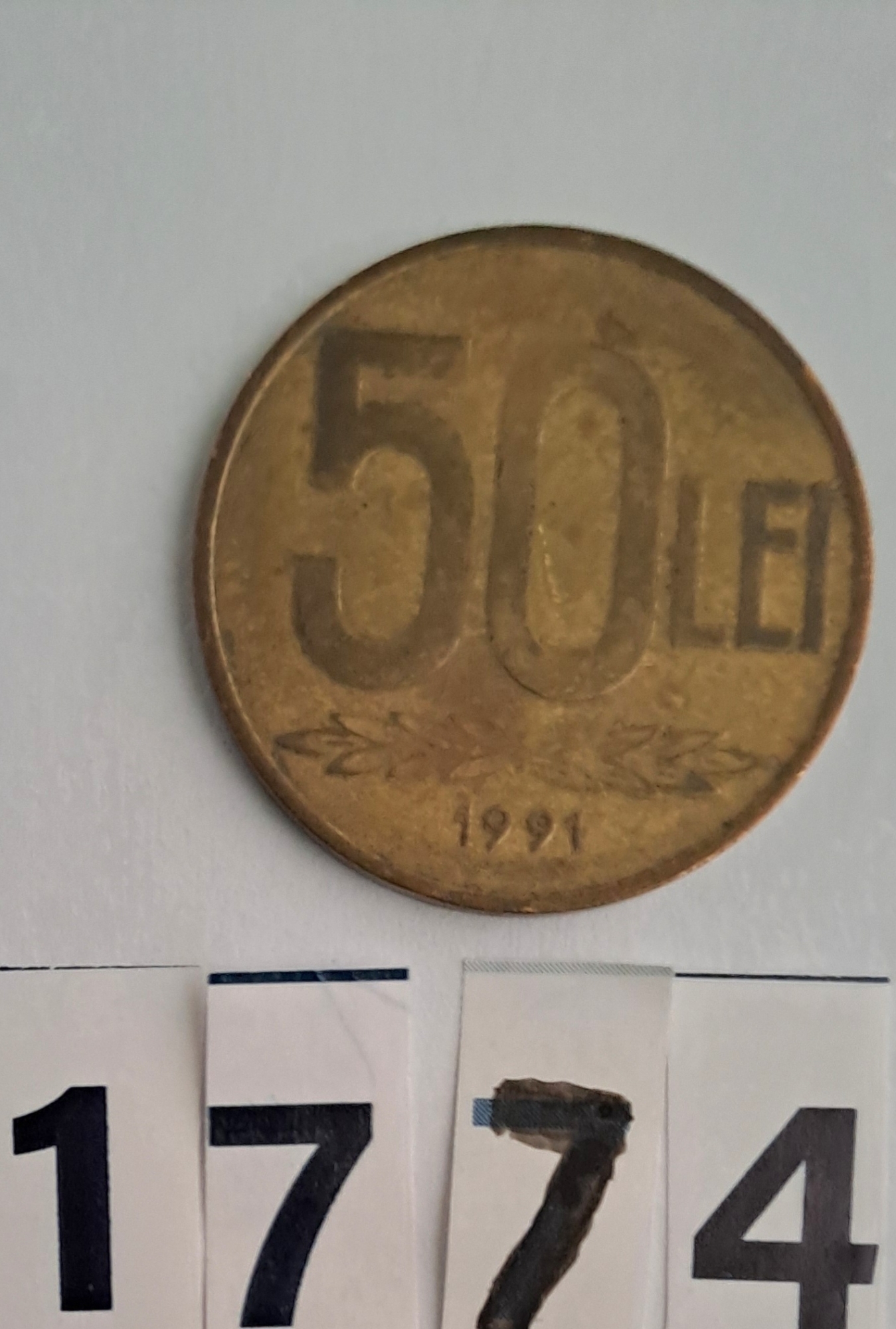 Monedă de formă rotundă, galbenă . Avers; 50 LEI, 1991. Verso : ALEXANDRU IOAN CUZA , ROMÂNIA