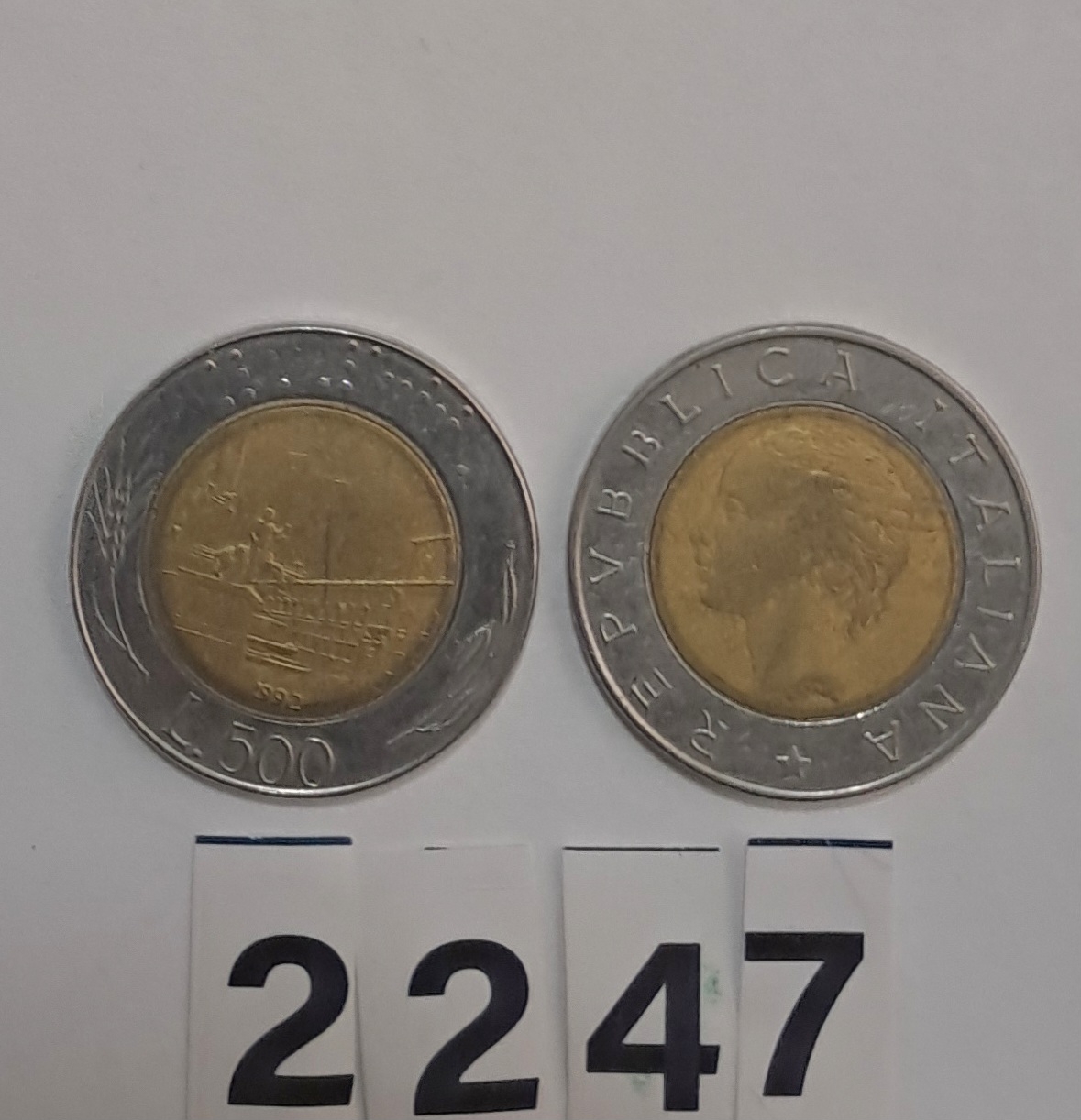 Monedă de formă rotundă, din metal. Avers; În cerc galben , cap de femee profil stânga. Sub tăetura gâtului, inscripția - CRETARA. Pe margine circumferință albă cu inscripția : REPUBLICA ITALIANA. Revers : În cerc pe centru, vedere a Pieței del Quirinale și Palatul cu acelaș nume. Sub margine anul de emitere 1992. Pe inelul exterior în partea de jos, valoarea nominală L.500, câmp monetar mărginit de un cerc. Muchie: Zâmțată cu secțiuni netede.