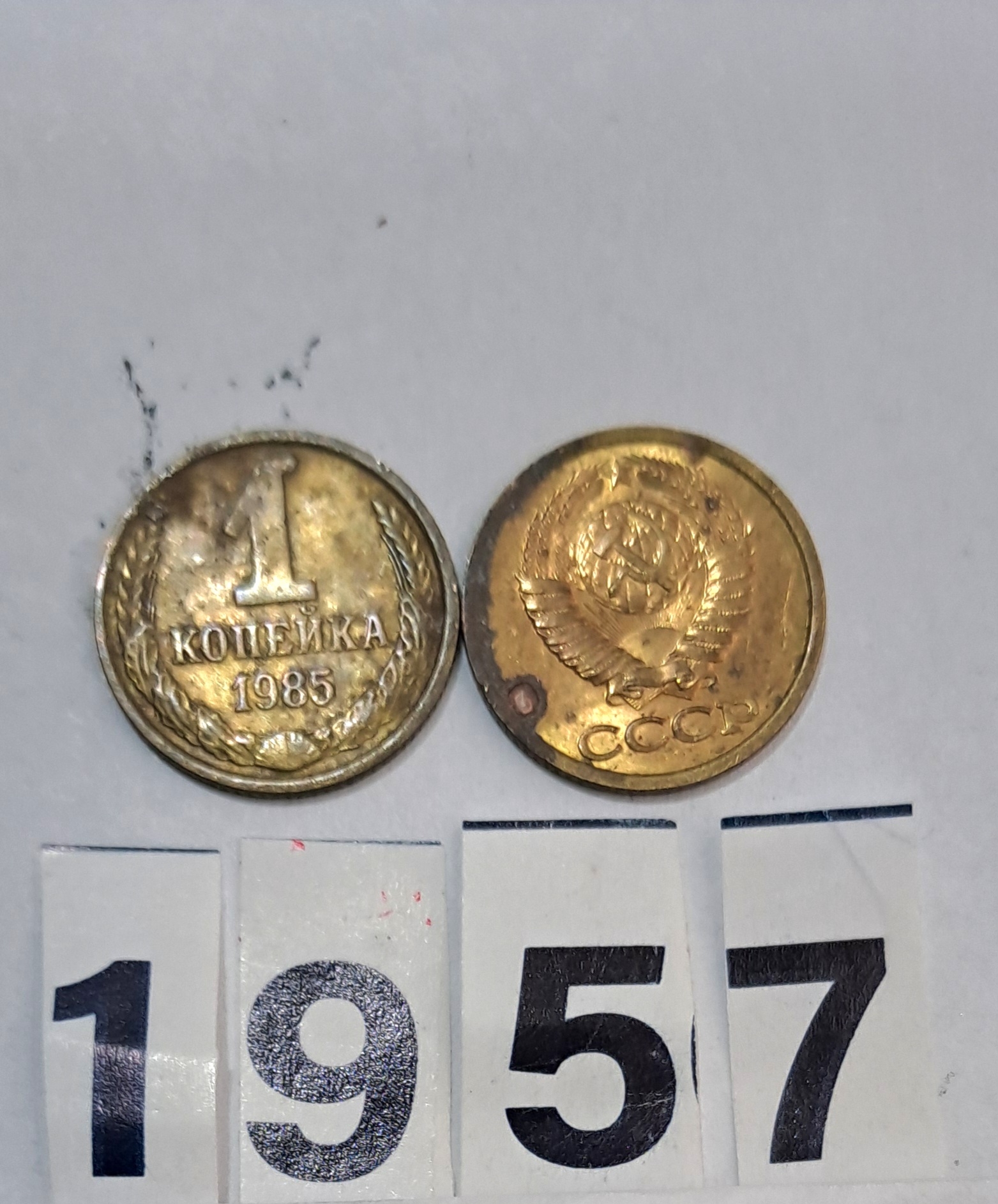 Monedă de formă rotundă, din metal, galbenă . Avers; Inscripția 1 корейка, ornament coroană din spice. 1985. Verso : Inscripția * СССР *, imagine Stema de Stat .