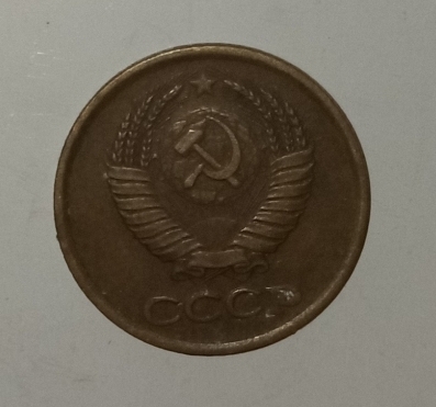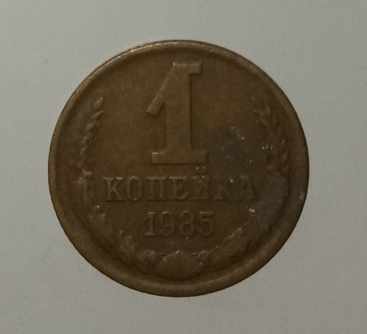Pe aversul monedei sunt inscripționate valoarea nominală ,,1”, iar sub el scrie copeici (КОПЕЕК). Sub valoare este anul de emisiune: 1985. Toate aceste elemente sunt înconjurate de două spice de grâu.
