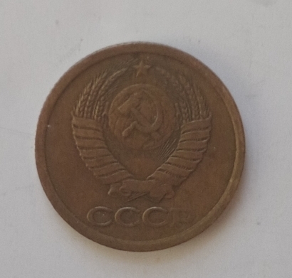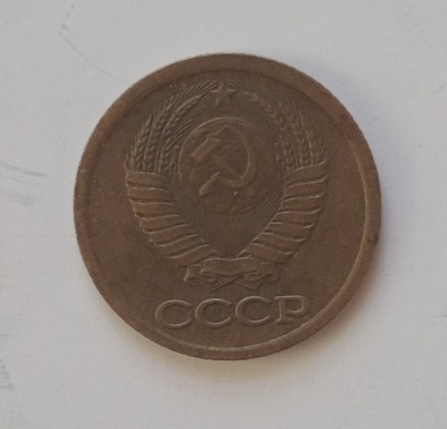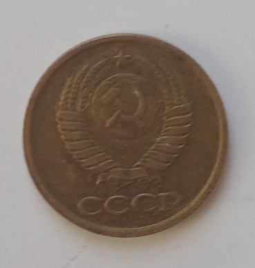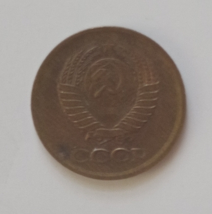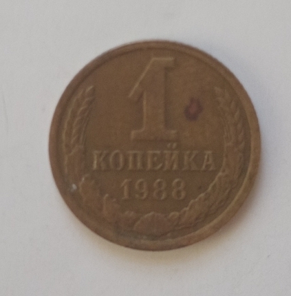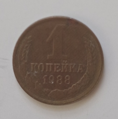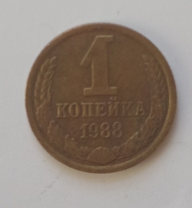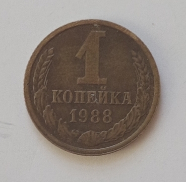 Pe aversul monedei sunt inscripționate valoarea nominală ,,1”, iar sub el scrie copeici (КОПЕЕК). Sub valoare este anul de emisiune: 1988. Toate aceste elemente sunt înconjurate de două spice de grâu.
