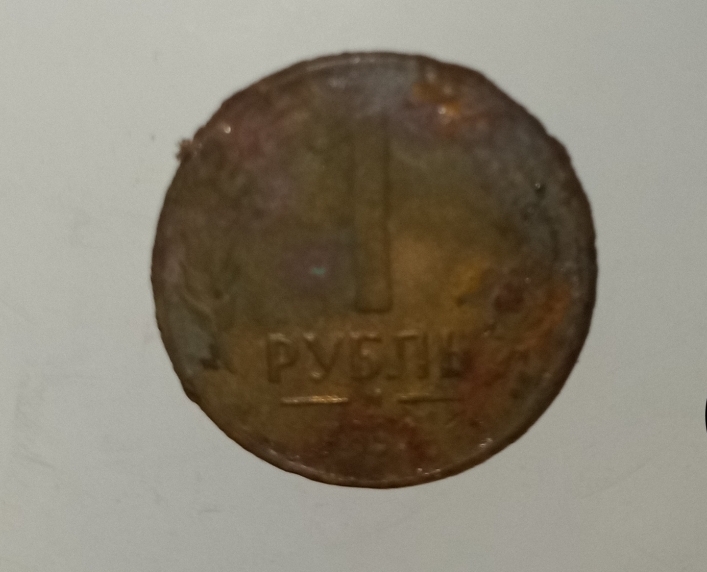 Avers: în centru este un număr ușor deplasat în sus „1” care indică denumirea monedei sub cuvântul „РУБЛЕИ” (RUBLEI), sub aceasta este indicată monograma (semnul) monetăriei: „M” - Moscova. În partea de jos, lângă marginea monedei, este arătat anul emiterii - 1992, în stânga o ramură de spic și în dreapta una de stejar.