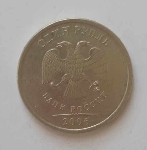 Reversul monedei înfățișează emblema Băncii Rusiei în mijloc - un vultur bicefal cu aripile coborâte; deasupra emblemei, într-un semicerc de-a lungul marginii, se află inscripția „BANKA RUSSIEI” ("БАНК РОССИИ") , iar dedesubt, cu aceeași dimensiune a fontului, dar pe orizontală, se află valoarea nominală - „O RUBLĂ” ("ОДИН РУБЛЬ"). În partea de jos a câmpului monedei se află anul băturii - „2006” - separat de partea superioară a modelului prin două linii orizontale care se subțiază spre margine, separate printr-un punct.