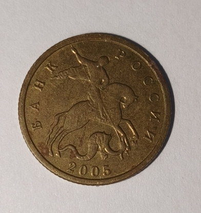 Moneda de formă circulară, standard - un disc plat cu o margine ușor ridicată. Marginea este marcată cu numeroase crestături orizontale (98 în total), valoarea nominală de 10 copeici. Aversul monedei valoarea nominală este indicată de o cifră mare „10”, pe axa centrală în partea de sus. Sub valoarea nominală se află cuvântul „COPEICI” ("КОПЕЕК"), centrat pe valoarea nominală. Un ornament decorativ sub forma unei ramuri de plantă este prezentat în stânga și partea de jos a monedei și doar o mică porțiune pe dreapta. Reversul monedei înfățișează o imagine a Sfântului Gheorghe cel Victorios călare, ucigând un dragon cu o suliță. Sub copita calului se află marca monetăriei: „M” (Moscova). Lateral, pe semicerc de-a lungul marginii, se află inscripția „BANKA RUSSIEI” ("БАНК РОССИИ"), În partea de jos a câmpului monedei se află anul băturii - „2005”.