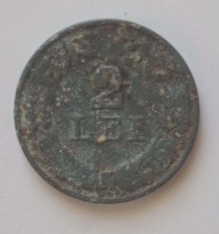 Aversul monedei în centru are valoarea nominală 2/LEI, totul înconjurat de o ghirlandă circulară de spice de grâuşi ştuleţi de porumb.