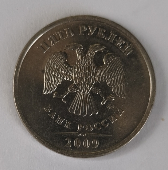 Reversul monedei înfățișează emblema Băncii Rusiei în mijloc - un vultur bicefal cu aripile coborâte; deasupra emblemei, într-un semicerc de-a lungul marginii, se află inscripția „BANKA RUSSIEI” ("БАНК РОССИИ") , iar dedesubt, cu aceeași dimensiune a fontului, dar pe orizontală, se află valoarea nominală - „CINCI RUBLE” ("ПЯТЬ РУБЛЕЙ"). Sub gheara dreaptă a vulturului se află o mică marcă ovală a monetăriei. În partea de jos a câmpului monedei se află anul băturii - „2009” - separat de partea superioară a modelului prin două linii orizontale care se subțiază spre margine, separate printr-un punct.