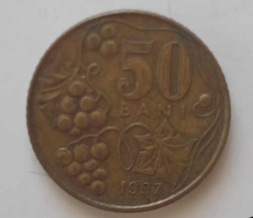 Revers: denumirea este afișată în dreapta sus: numărul „50”, cu cuvântul „BANI” dedesubt și data bătării „1997” dedesubt. Spațiul rămas este umplut cu imaginea unei crengi de struguri cu ciorchini de struguri.