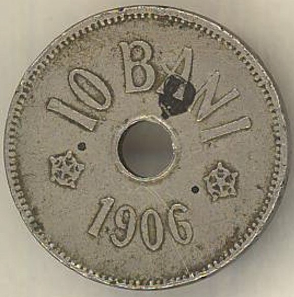 rotundă cu muchie netedă, cerc perlat, bortelită la mijloc. Avers: valoarea nominală şi anul emiterii. Revers: (sus) coroana imperială, jos pe o panglică - "România".