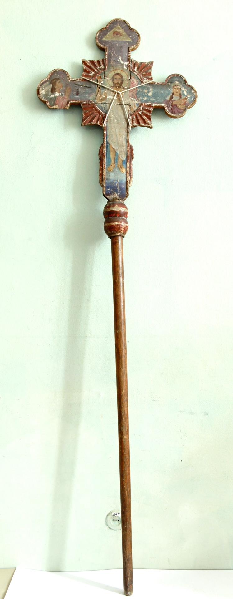 cu 4 braţe, se termină în forme trilobe. Crucea e cu 2 feţe: 1) scena canonică a Răstignirii lui Iisus, 2) scena Învierii pe fundal albastru. În partea centrală sunt redate raze ce alcătuiesc un nimb, luminînd figura lui Isus Hristos.
