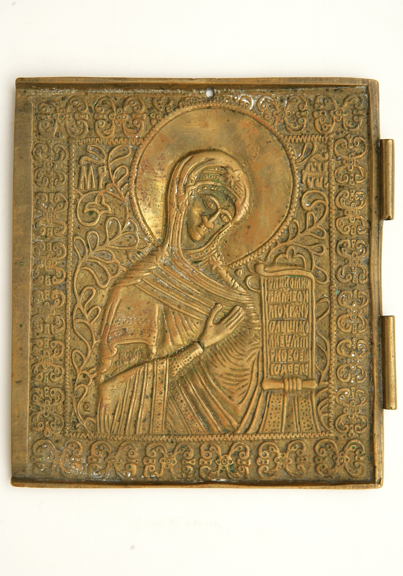 Pe fondal vegetal: Maica Domnului (bust) cu sul desfăşurat (cu text) în mîna stg. Chenar cu ornament.