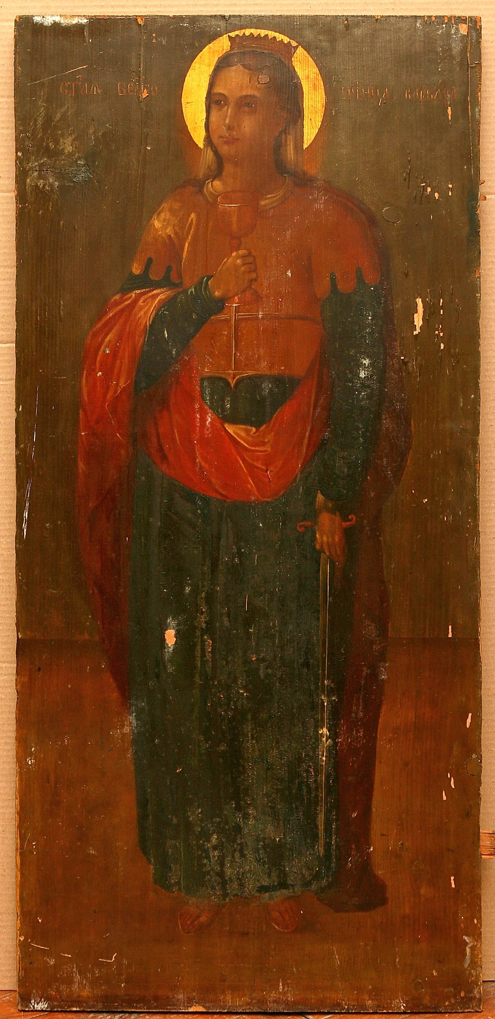 Pe fondal de culoare oliv e redată în plină statură - Sfînta Mare Muceniţă Varvara. Poartă veşmănt verde, armură şi mantie roşie. Pe cap - coroană, încercuită de nimb auriu. În mîna stîngă ţine o cupă, în cea dreaptă - sabie cu vîrful în jos. Capul uşor întors spre stînga. Inscripţii sus: "Marea Muceniţă Varvara" în slavonă.