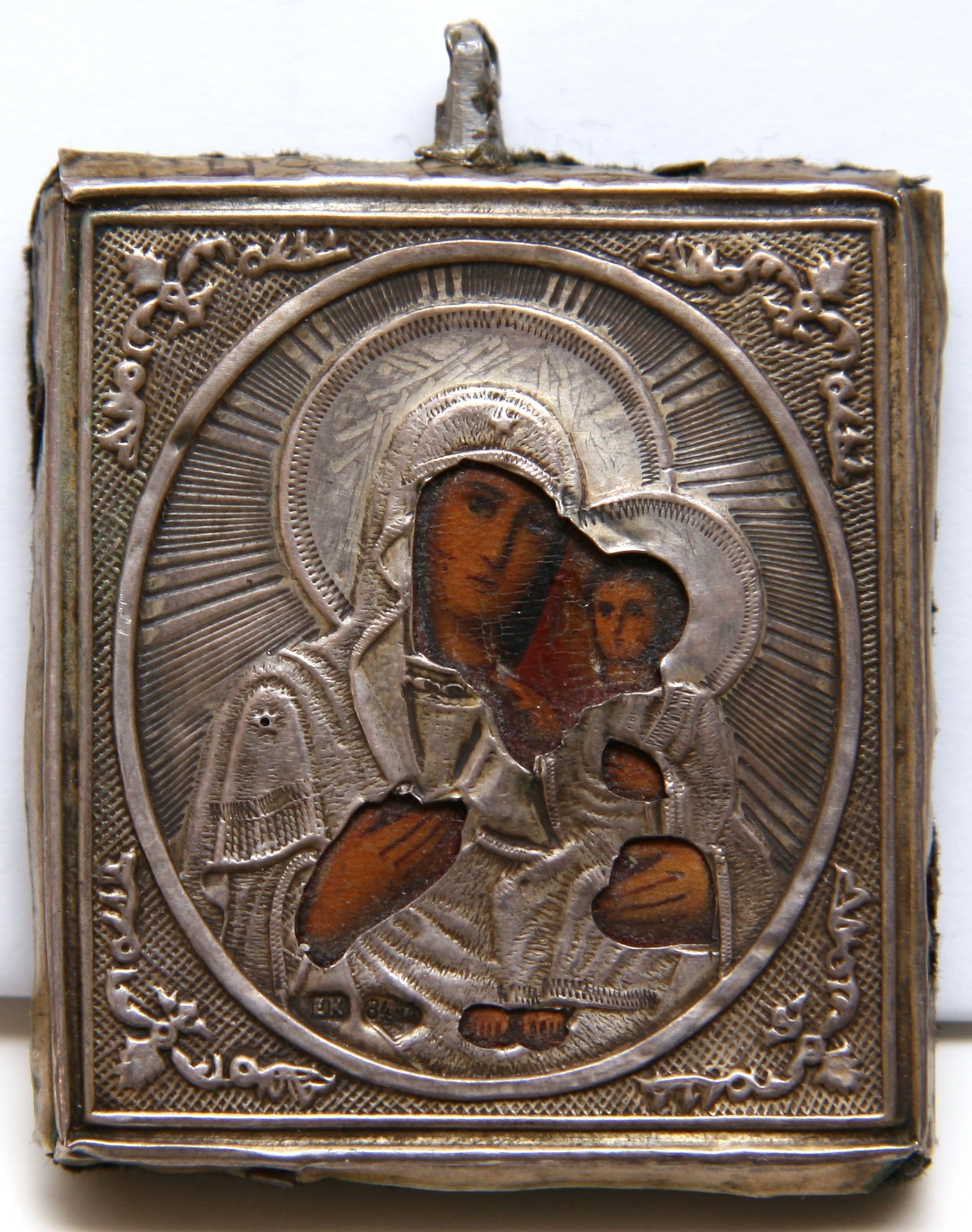 Este reprezentat chipul Maicii Domnului cu Pruncul. Ferecătura cu ornament, acoperă pe toată suprafaţa în afară de feţe, mâini şi picioare