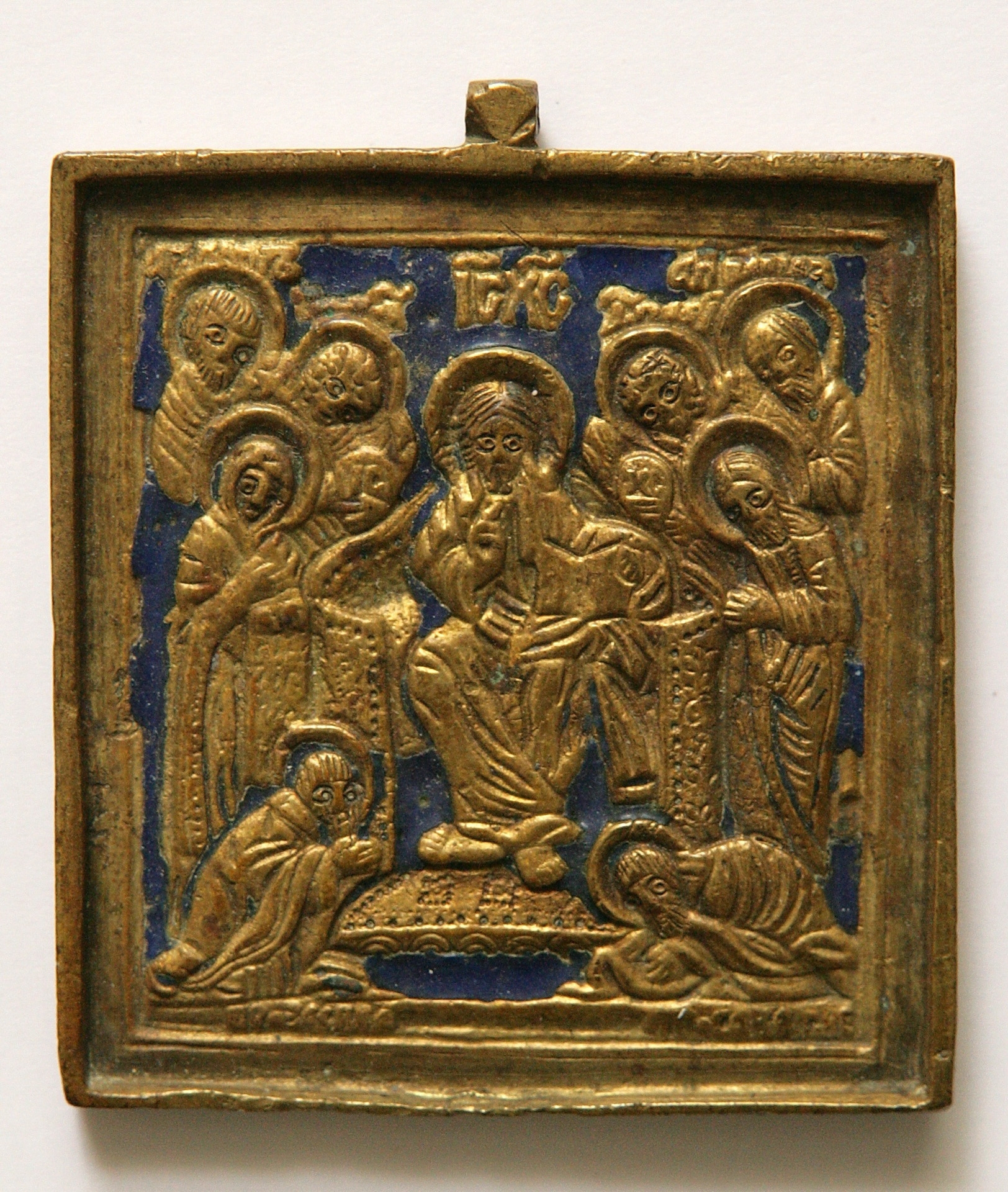 Centru, pe fon emailat în albastru: Hristos tronează înconjurat de aposoli, în plină statură şi îngenunchiaţi. Sus: monogramă. Chenar cu diferenţe de nivele. De asupra: urechiuşă.