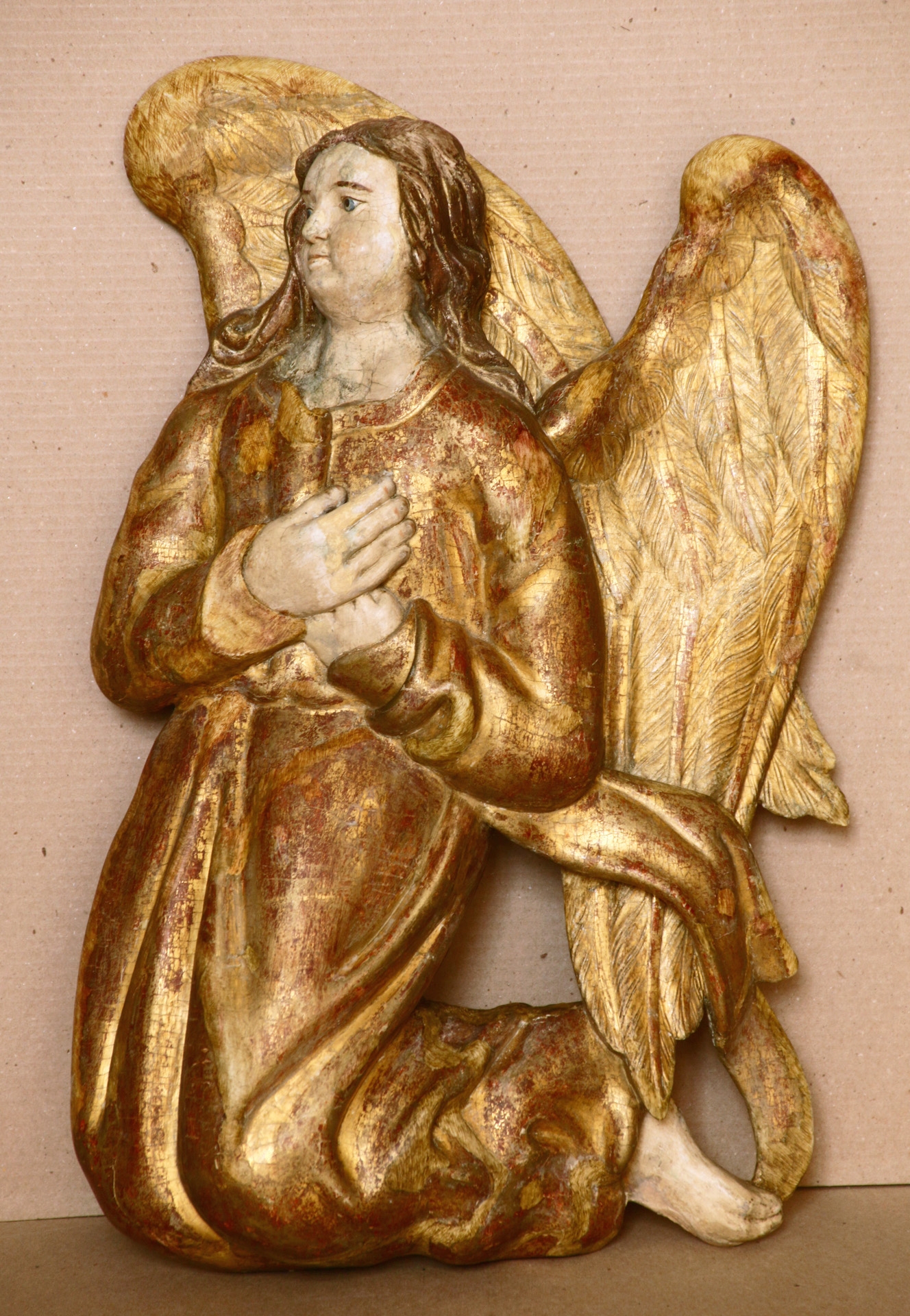 Înger sculptat în lemn, reprezentat în genunchi în 3/4 spre stg. Mîinile împreunate la piept, gama cromatică: auriu, ocru, cafeniu, maro.