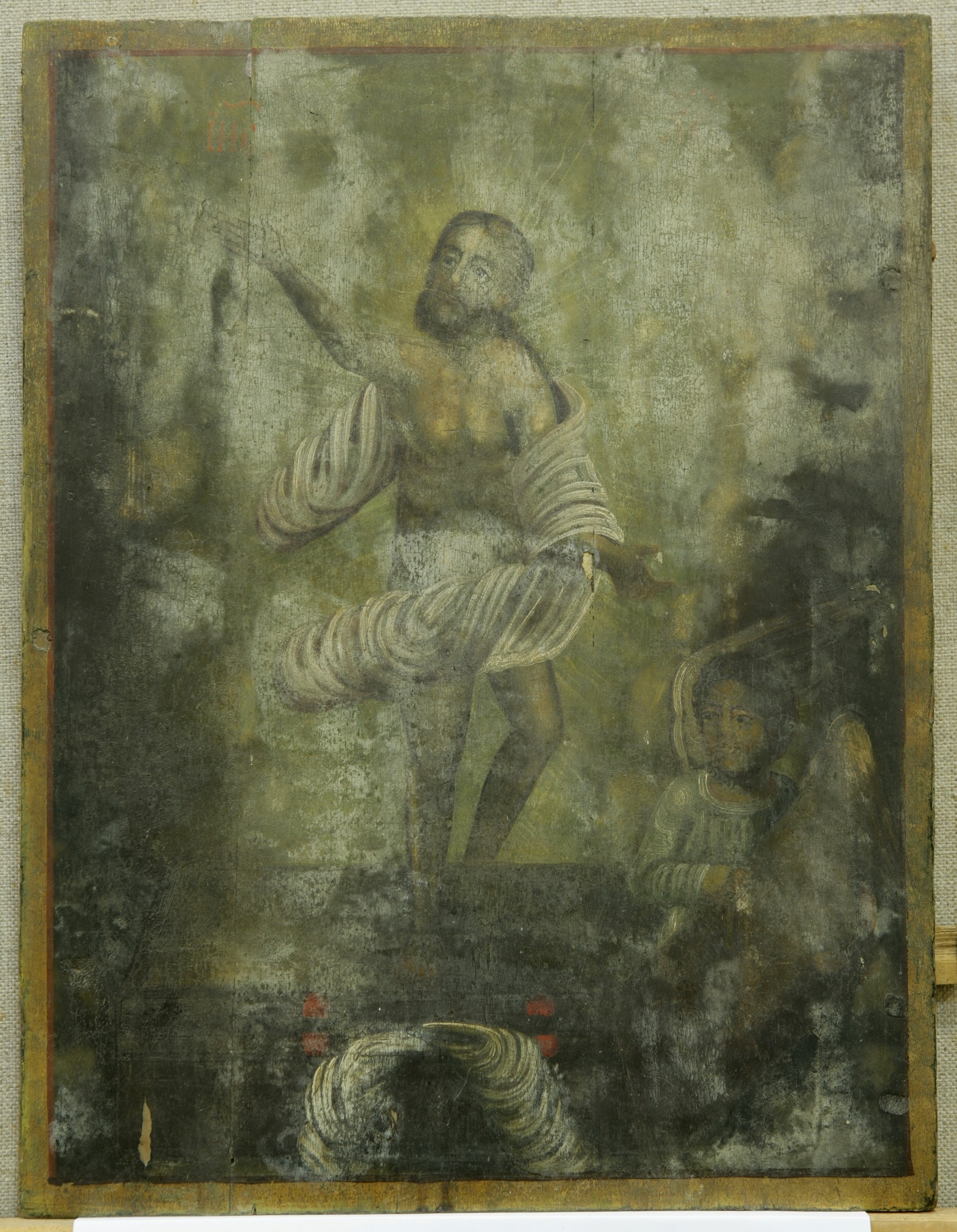 Chipul Mîntuitorului în statură. La picioarele lui - mormîntul. Drp jos: înger. Fondal neutru. Gama: verde, alb, negru.