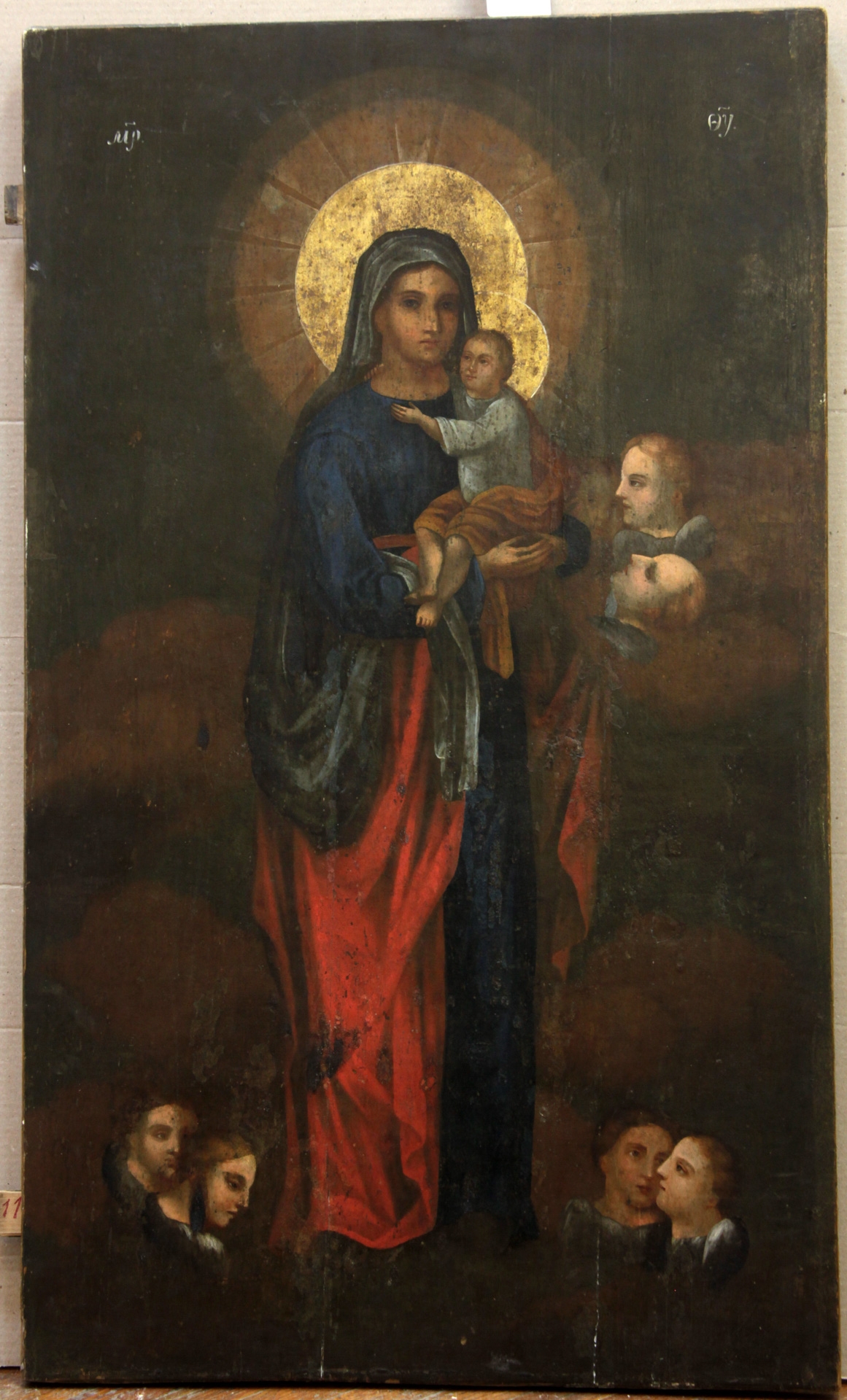 Pe fondal închis, Maica Domnului în statură îl ţine pe Iisus în braţe. Ea poartă chiton albastru şi mantie roşie, pe cap - acoperămînt gri-alb. Pruncul - în chiton albastru şi himation ocru. În drp Lui - 2 îngeri. Lateral jos - cîte 2 îngeri (la picioarele Maicii Domnului). Nimburi aurii. Nori cafenii.