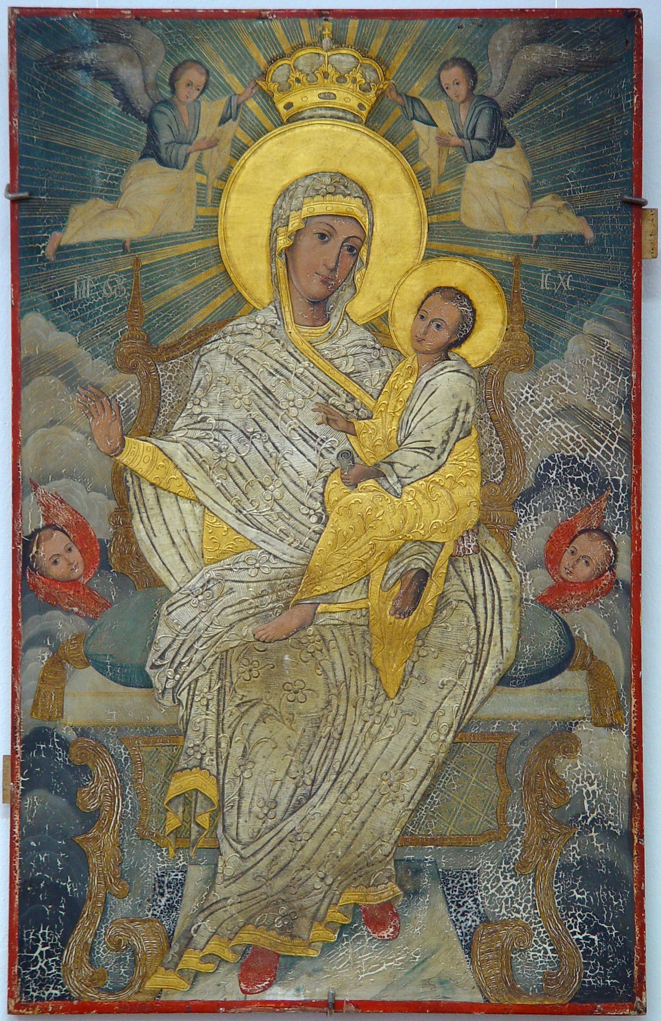 Pe tron - Maica Domnului, îl ţine pe Iisus pe braţul stg. Ambii în veşmînte aurii şi argintii reliefate cu decor floral. Pe capul Fecioarei: coroană auriu-argintie, susţinută de 2 îngeri. Lateral tronului: cîte un serafim cu aripile roşii. Nimbul Maicii Domnului reflectă raze aurii. Fondal. Nori gri-azurii.
