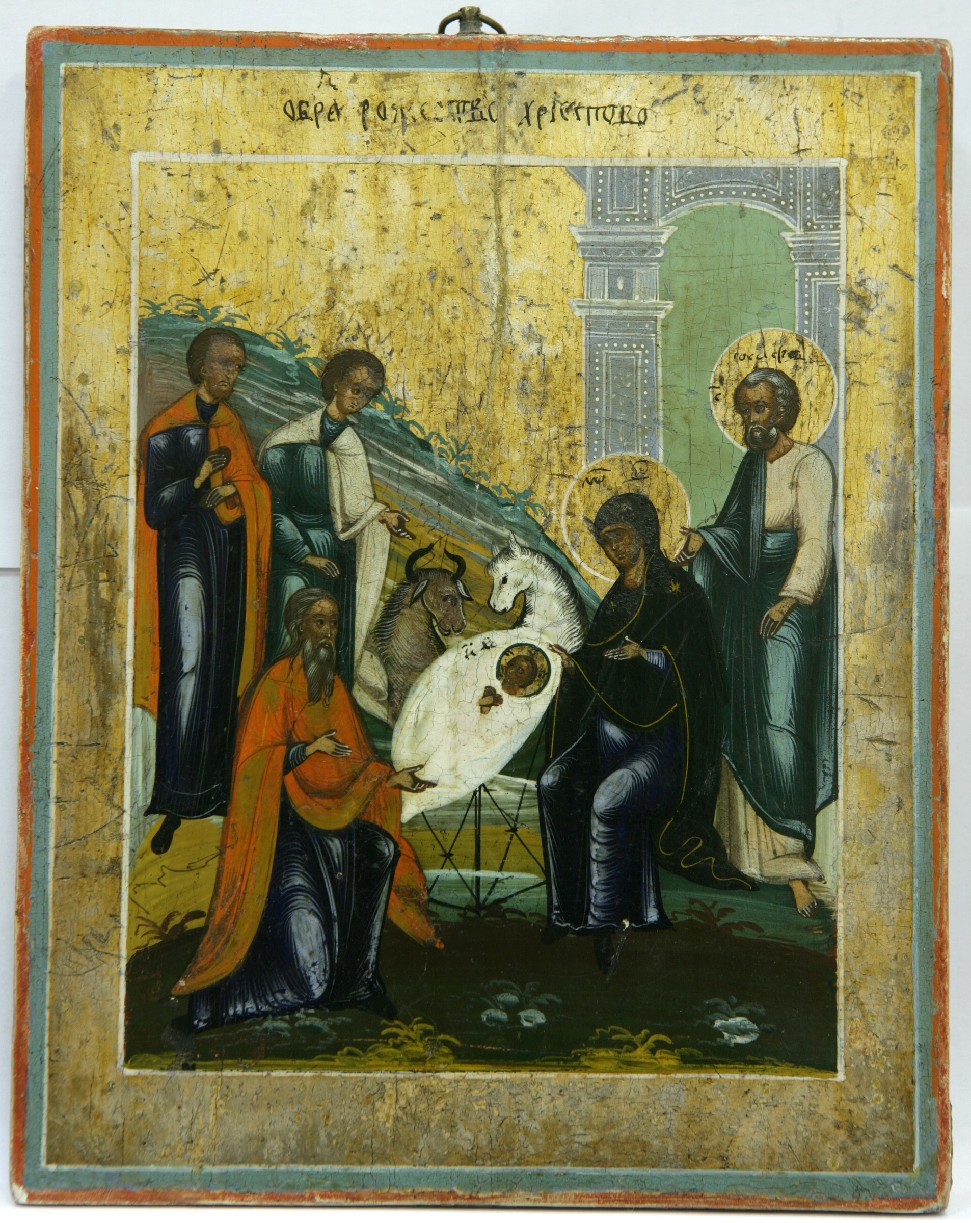 Chipul Pruncului Iisus în scutece albe, culcat în iesle, redat la centru. Stg - 3 magi, unul îngenunchiat. Drp: Maica Domnului în veşmînte de culoare închisă, aşezată lîngă Prunc. Lîngă Ea - Dreptul Iosif în plină statură. Centru, stg, lîngă Iisus - 2 bovine. Fondal stg: peisaj cu munte, drp - construcţie arhitectonică cu coloane.