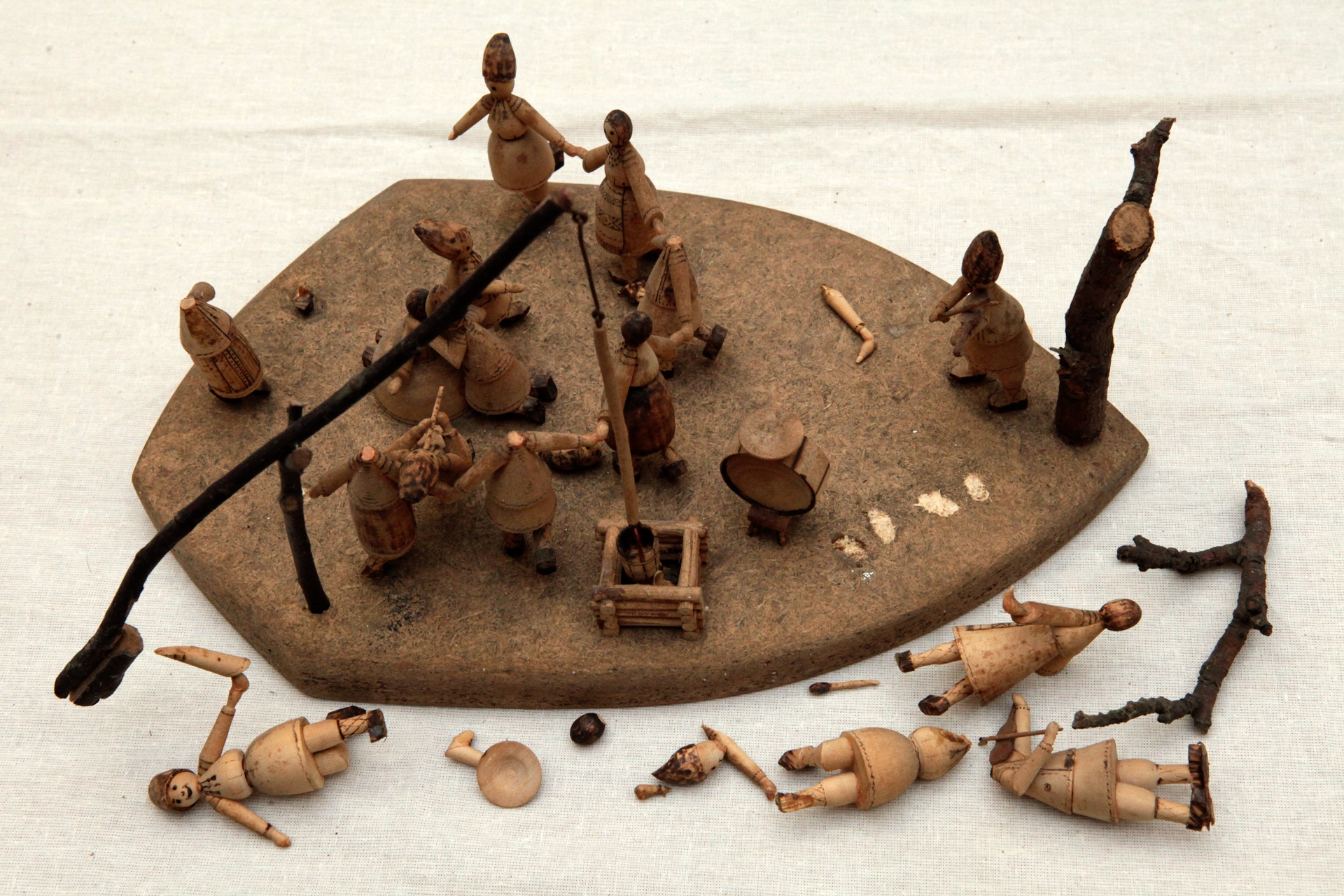 Scenă de petrecere cu 16 personaje în straie tradiţionale: taraf cu muzicanţi şi dansatori; o fîntînă cu cumpănă şi un arbore. Scenă plasată pe un suport de lemn de formă romboidală neregulată.
