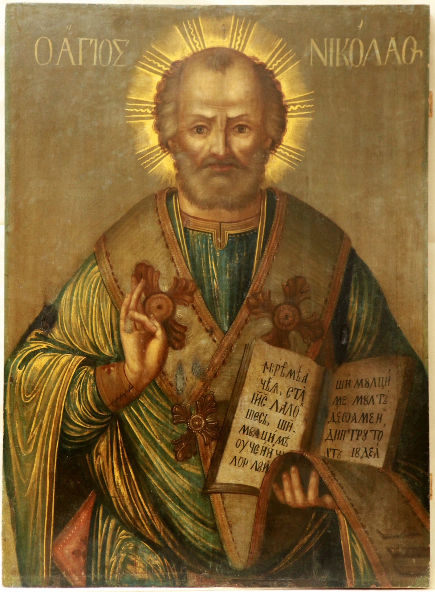 bust. Poartă haine arhiereşti de culoare verde-ocru. Ţine în mîna stg Epitrahilul şi Evanghelia deschisă, cu mîna drp binecuvîntează. Nimbul din multiple raze aurii. Fondal neutru.