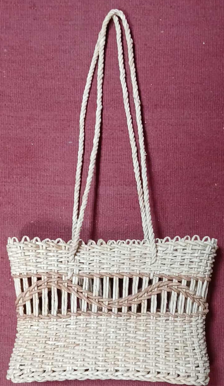 Poșetă de formă rectangulară, împletit din pănuși deschise la culoare, cu o bandă decorativă centrală realizată prin tehnică de împletire în valuri. Mânerele sunt lungi, duble, realizate din șnururi răsucite, prinse direct în structura genții. Aspect rustic, natural, specific artizanatului lucrat manual.