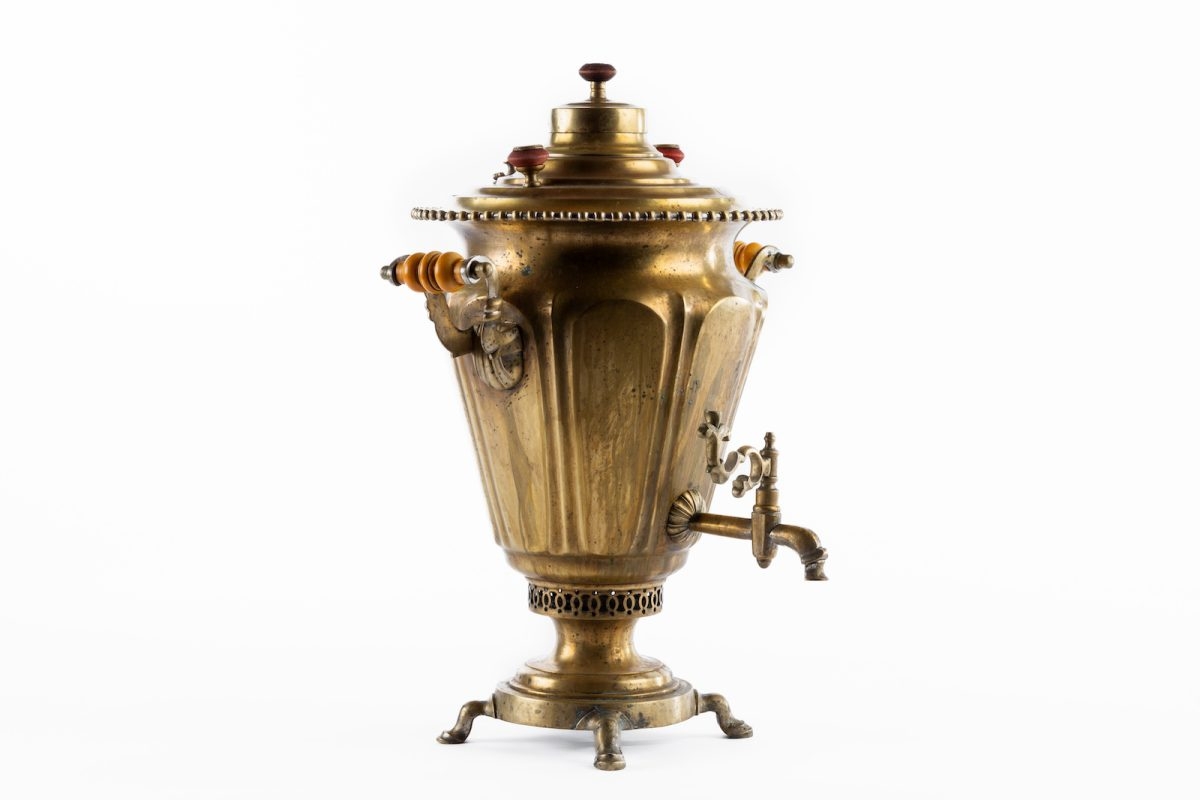 Samovar de casă, rusesc, din alamă, în formă de vază. Este format dintr-un postament prevăzut cu 4 piciorușe ”labe de leu” pe care se află cenușarul, corpul propriu-zis al samovarului (cu tubul central în care se introduc cărbuni aprinși) cu două anse (din metal și lemn) fixate în nituri, robinet cu cheiță rotativă, capac cu orificii pentru „cucuie” (vaporizatoare), capac pentru tub cu mâner din lemn. Pâlnia pentru ceainic nu este prevăzută. Este realizat în celebra manufactură a familiei Voronțov din Tula (oraș considerat ca fiind patria samovarelor). Pe piesa respectivă sunt imprimate mai multe inscripții, stema Rusiei imperiale și medaliile (avers și revers), obținute de fabrica respectivă la expozițiile sau târgurile producătorilor ruși. Inscripții: pe capac, lângă marcă – [Фабрика Воронцова въ Тулћ] – Fabrica lui Voronțov din Tula. Inscripția este separată în două de imaginea unei păsări cu aripile desfăcute. Imaginea păsării este flancată de inițialele încercuite ale producătorului [Н] (N) și [А] (A). Samovarul (din rusă „самовар”, însemnând „care fierbe de la sine”; în persană: „samāvar”; în turcă: „semaver”) este un vas de metal, prevăzut cu un încălzitor, în care se fierbe apa folosită mai ales la prepararea ceaiului. Este utilizat în mod tradițional în Rusia și în țările adiacente, dar și în alte regiuni din centrul, estul și sud-estul Europei, în regiunea Cașmir și în Orientul Mijlociu