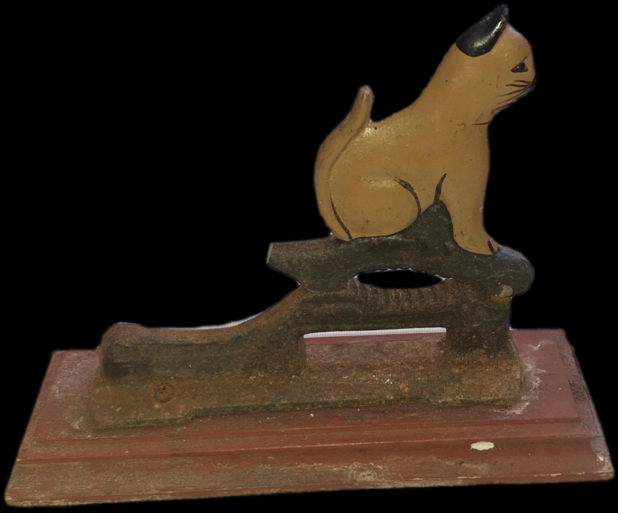Spărgător de nuci occidental. Baza este din lemn, vopsit vișiniu. Cu cuie este prinsă spărgătorul din fier, ruginit în partea de jos. În partea de sus, (mânerul) este o pisică, vopsită ocru, cu detalii negre.