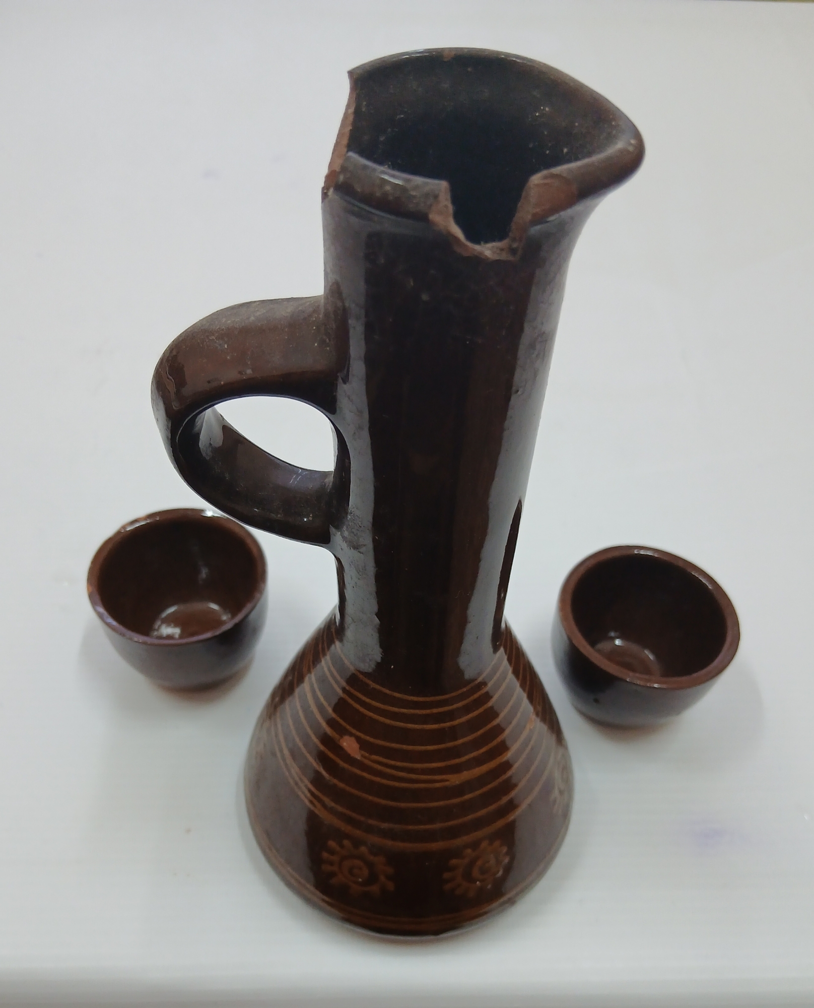 Set de ceramică compus dintr-un ulcior și două cănuțe.Ulciorul are corp bombat, gât îngust și lung, toartă mică prinsă de gât.Cănuțele sunt de dimensiuni mici, formă rotungităfără torți. piesele sunt realizate din lut și smălțuite.Obiectele erau folosite în gospodărie pentru păstrarea și servirea apei, vinului sau altor băuturi.