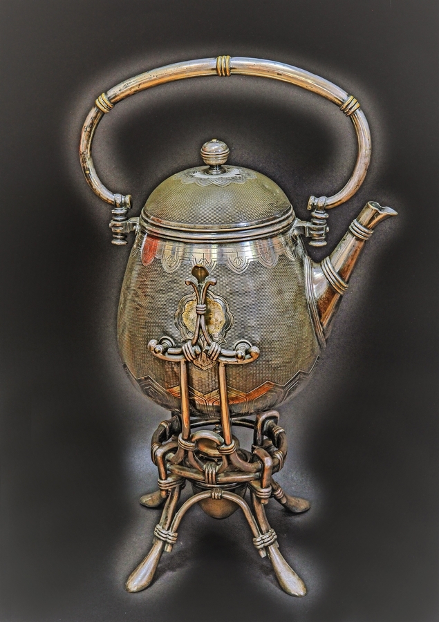 Ceainicul are o structură complexă, articulată, alcătuită dintr-un recipient piriform, cu suprafața ornamentată în tehnica guilloché, bazată pe modele în stilul Louis al XVI-lea, de la sfârșitul anilor 1780. Baza și partea superioară este decorată cu frize de lalele înscrise în lambrechini, iar pe centru este gravat un ecuson încadrat într-un chenar ajurat, dublu. Are țurțur și toartă rebatabilă în coș, izolată cu inele triple și capac cu buton sferic. Pe recipient sunt fixate două nituri pentru fixarea lui pe stativ. În mijlocul stativului este așezată spirtiera cu mâner drept și dispozitiv de reglare a fitilului. La bază este marcat cu poansonul firmei Christofle.