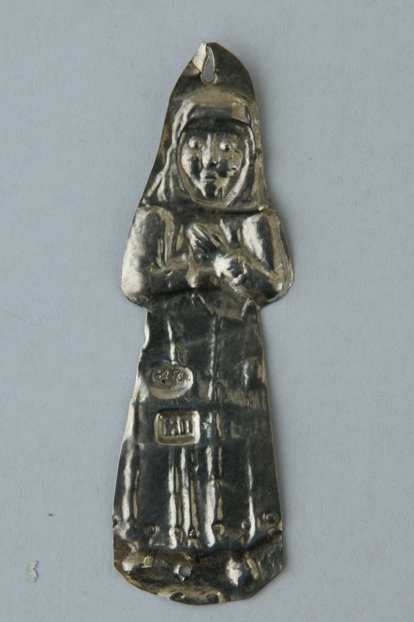 Obiectul votiv reprezintă o foiță de argint subțire, pe care s-a imprimat imaginea unei defuncte, cu ochii închişi, cu mâinile pe piept (stânga peste dreapta). Are veşminte lungi, strânse la mijloc, cu decor perlat la poale, încălţămintea rotunjită la bot. Capetele voalului de pe capul femeii se suprapun la gât și coboară peste umeri. Pandantivul este dublu perforat în locul perforaţiei de sus se atestă o ruptură. Obiectele votive ale gravorului Pisahov G.M. se păstrează în Muzeul de Istorie de Stat din Moscova.