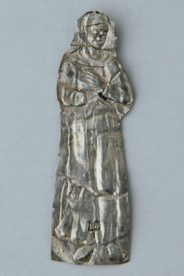 Pe foița de argint se distinge chipul unei femei, cu capul întors spre stânga, cu ochii închişi, cu mâinile pe piept, mana stângă fiind situată mai sus de cea dreaptă. Are veşminte lungi, pe cap voal mare cu marginile lăsate peste umeri și încălţămintea ascuţită la bot. Este semnat cu inițialele „П.М.” (PM). Obiectele votive ale acestui gravor se păstrează în Muzeul de Istorie de Stat din Moscova.