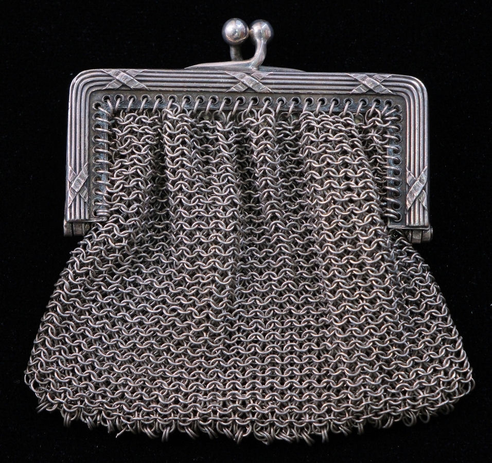 : Poșetă/portmoneu de formă trapezodală, cu structură complexă. Corpul poșetei este format dintr-o minuțioasă împletitură de zale fine, intercalate în prinderi sudate. Garda, cu muchiile rotunjite, este decorată cu ornament liniar, alternat cu x-uri dispuse simetric. Portmoneul este prevăzut cu clemă de închidere cu butoane sferice și anou de prindere la centura chatelaine. Interiorul este compartimentat în două secții. Pe partea laterală a cadrului sunt aplicate trei mărci ilizibile.