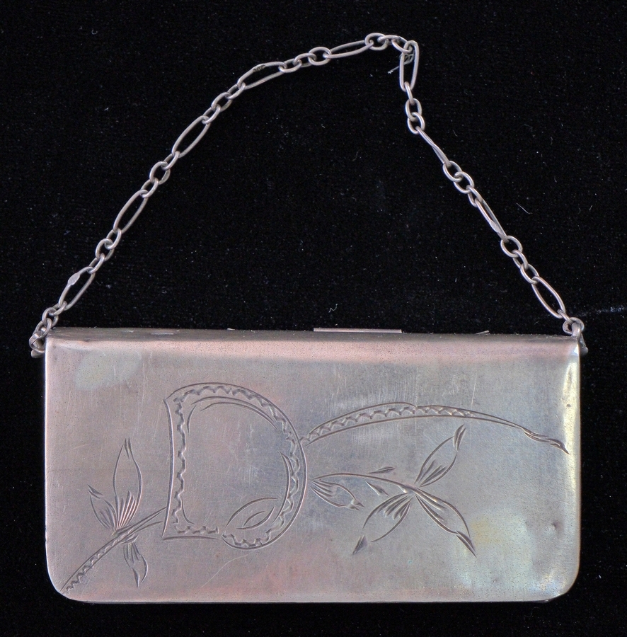 Portmoneu de formă dreptunghiulară cu colțurile rotunjite. Este compus din două părți egale unite prin șarnieră. Registrul decorativ este compus din litera majusculă „D”, ornamente vegetale și linii în zigzag, gravate pe fundal lis. Ambele părți sunt marcate cu poansonul meșterului Lev Vasiliev„ ЛВ” și marca Biroului de marcare din orașul Kaluga, Rusia.