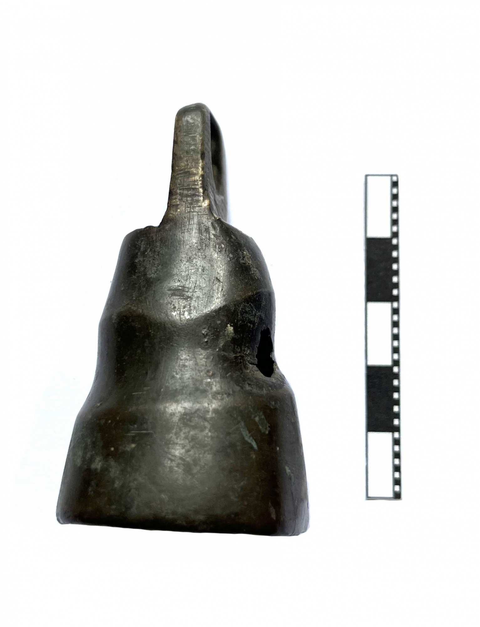 Clopoțel turnat din bronz, în tipar bivalv. Acesta are corpul înalt, cu cupa de formă ovală neregulată în secțiune și conică în plan. În zona mediană piesa este prevăzută cu un șanț lenticular neregulat care conține un orificiu triunghiular neregulat, ambele reprezentând un defect de turnare. Capătul superior se finisează printu-un mâner aplatizat, de formă dreptunghiulară cu colțurile superioare rotunjite. Acesta conține un orificiu oval alungit cu dimensiunea de 6 x 12 mm. Suprafața piesei este acoperită cu un strat de patină cafenie.