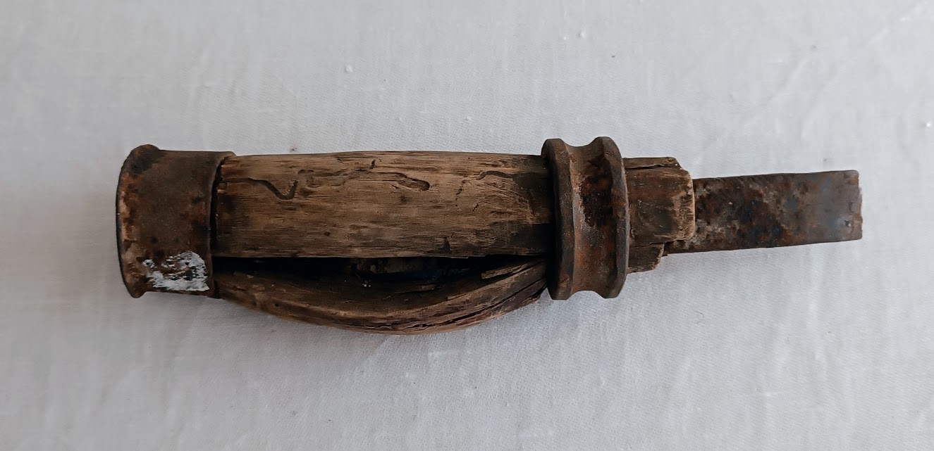 metalice la capetele mânerului pentru protecție de despicare. E folosită de lemnari, fierari, dulgheri, sculptori. Este în stare degradată.