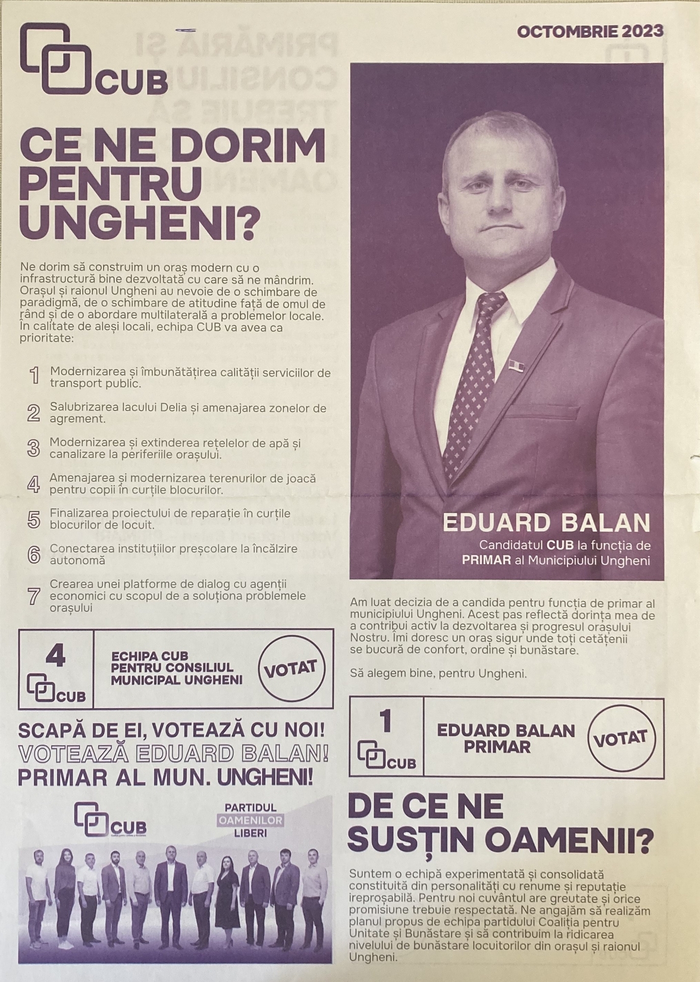Publicitate Electorală pentru Alegerile Locale din anul 2023 în Republica Moldova. Publicitatea - în favoarea candidatului la funcția de primar al municipiului Ungheni: Eduard Balan. Pe pagina 1 a piesei: fotografia candidatului Eduard Balan și logo-ul Coaliției pentru Unitate și Bunăstare - „CUB”. Candidatul Eduard Balan - membru a Coaliției pentru Unitate și Bunăstare - „CUB”; planul partidului „CUB” planul „CUB” împreună cu candidatul la funcția de primar al mun. Ungheni - plan compus din 7 puncte; fotografie cu membrii „CUB”; despre echipa „CUB” . Pe pagina 2 a piesei: obiectivele echipei „CUB” pentru Ungheni; fotografie mai mare (cu mai multi membri) a Coaliției; îndemnarea către cetățeni de a vota pentru Coaliție și pentru candidatul la funcția de primar Eduard Balan. Cromatică: alb, negru, mov.