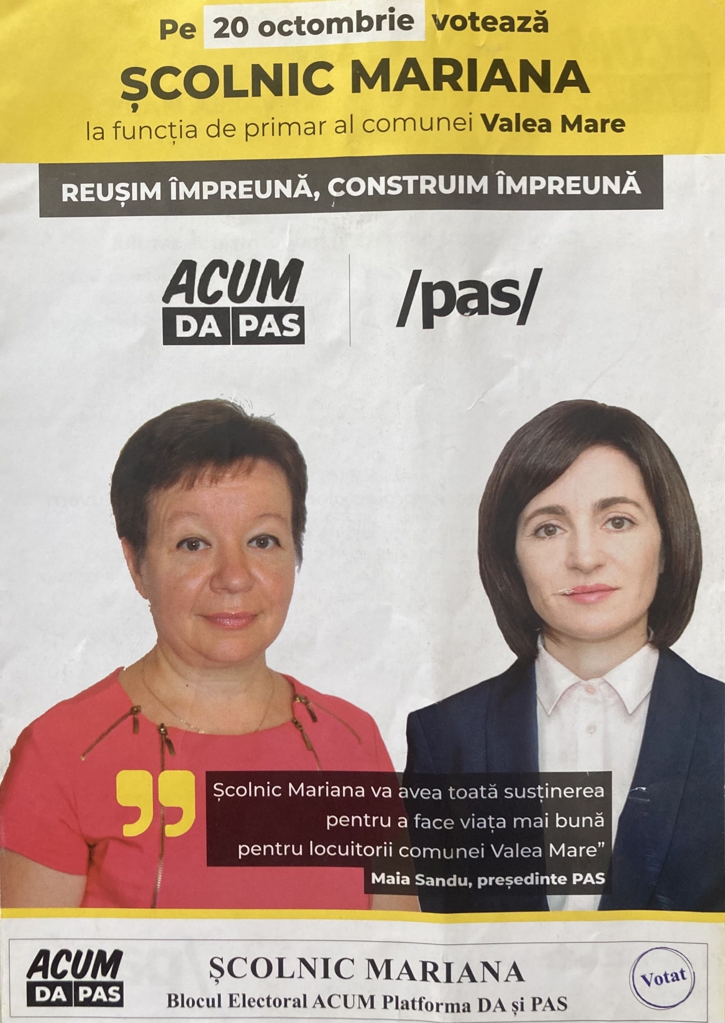 Pliant publicitar electoral. Publicitate Electorală - în favoarea candidatei blocului electoral „ACUM”, compus din platforma „DA” și „PAS” (Partidul „Acțiune și Solidarietate”), Școlnic Mariana, la funcția de primar al comunei Valea Mare. Piesa - editată pentru Alegerile Locale din anul 2019 in Republica Moldova. Piesa - conține 4 pagini. Pe pagină 1: data, luna votării; 1 fotografie cu doamna Școlnic Mariana alături de Maia Sandu; sloganul - „Reușim împreună, construim împreună”. Pe pagina 2 a piesei: 3 soluții pentru com. Valea Mare, pentru îmbunătățirea condițiilor de trai; 1 e-mail,1 număr de telefon și 1 îndemn (apel la acțiune) - „Implică-te acum”. Pe pagina 3: lista cu 11 consilieri locali propuși de blocul electoral „ACUM”. Pe pagina 4 a piesei (pe verso): 3 lucruri importante despre candidata Școlnic Mariana:1 fotografie și 1 exemplu de buletin de vot, cu ștampila „Votat” plasată în dreptul blocului electoral „ACUM” șu cu numele candidatei Școlnic Mariana. Cromatică: galben, negru, albastru, roșu, alb.