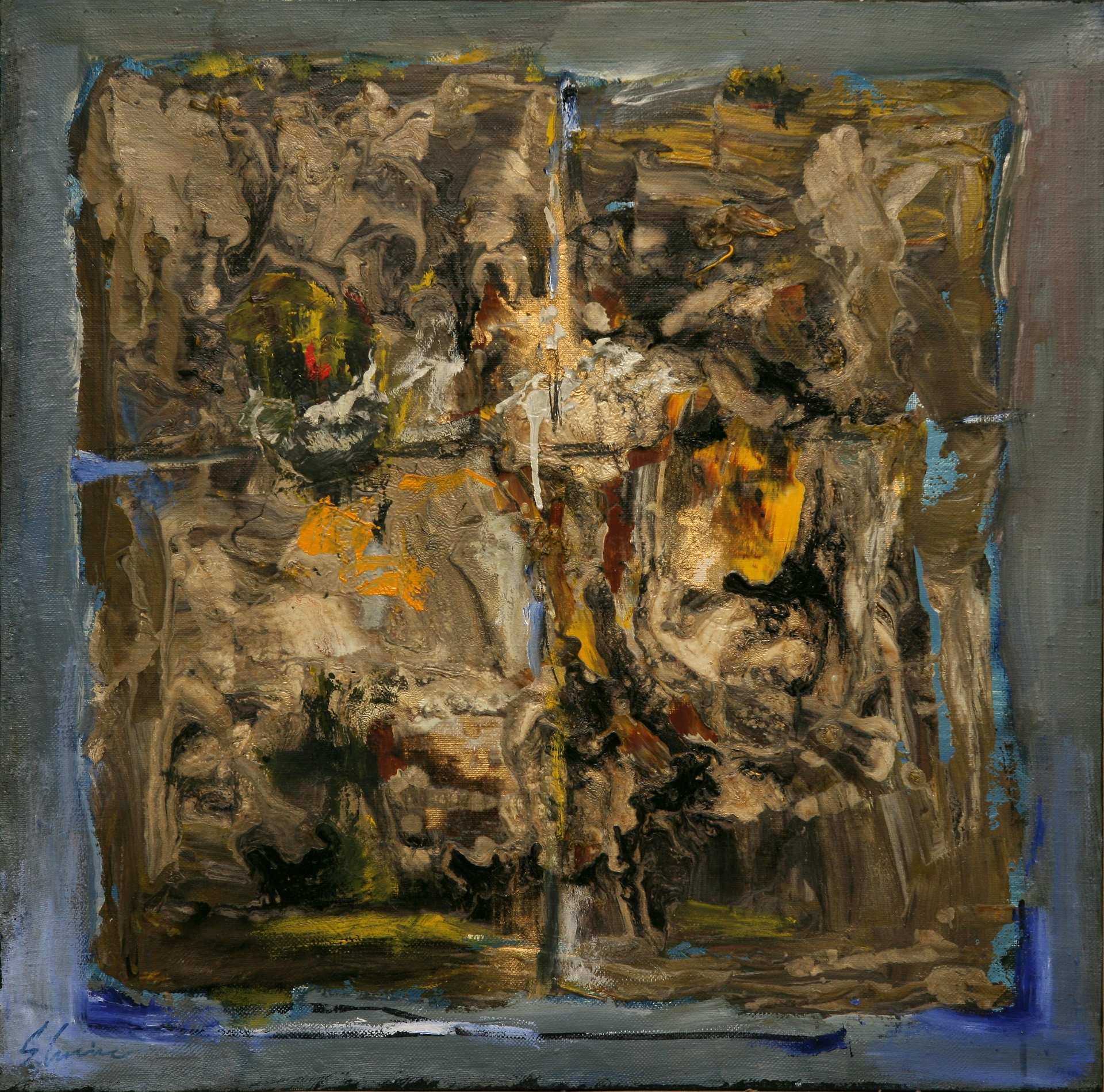 Compoziție abstractă în tușe de negru-brun, cu accente de ocru și cu nuanțe de albastru la margini. Semnat în stg jos cu albastru.