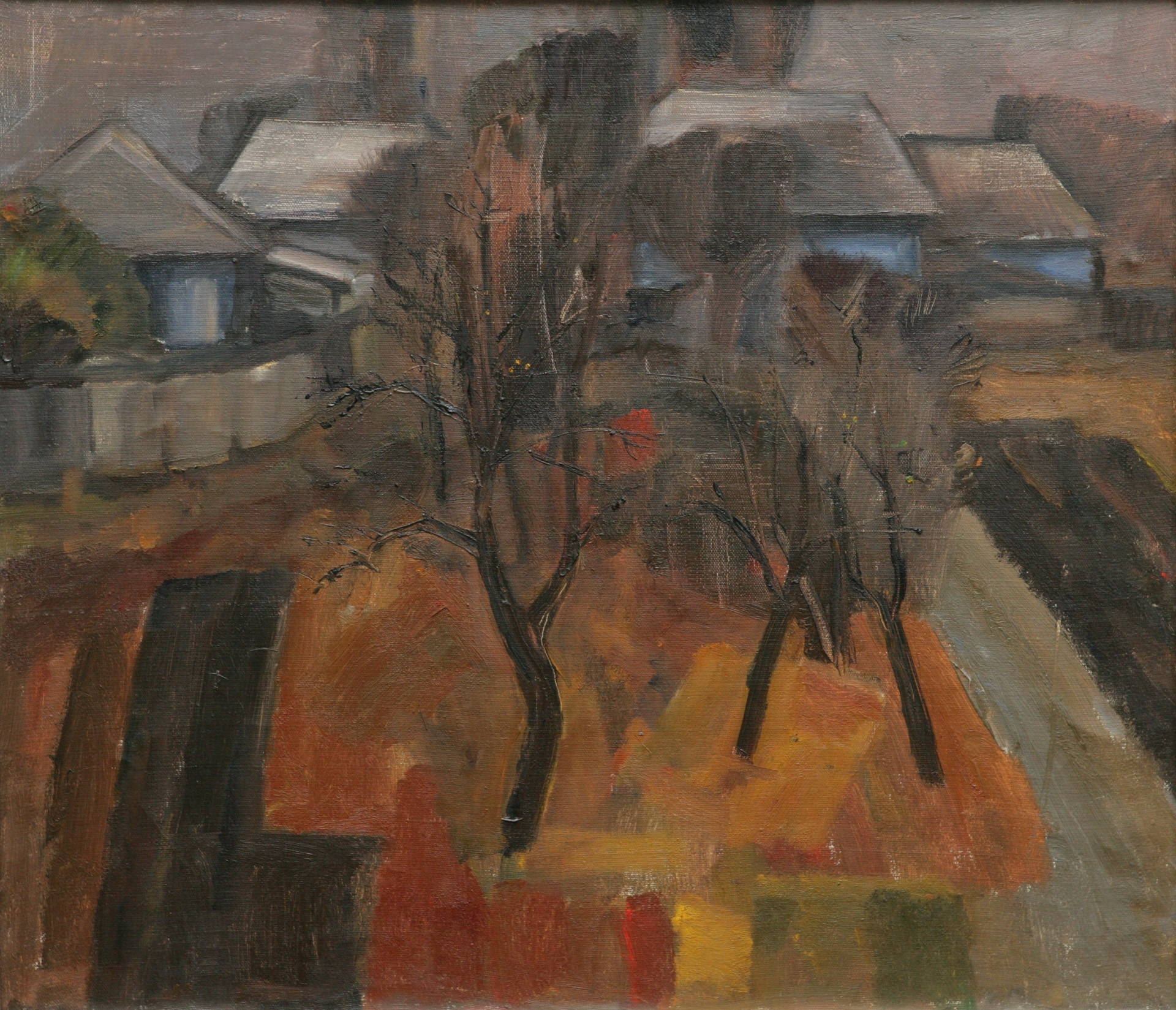 Peisaj rural. Prim plan, centru: copaci desfrunziţi. Plan secund: case ţărăneşti cu pereţi albaştri şi acoperişe gri. Gama: brun, ocru, gri.